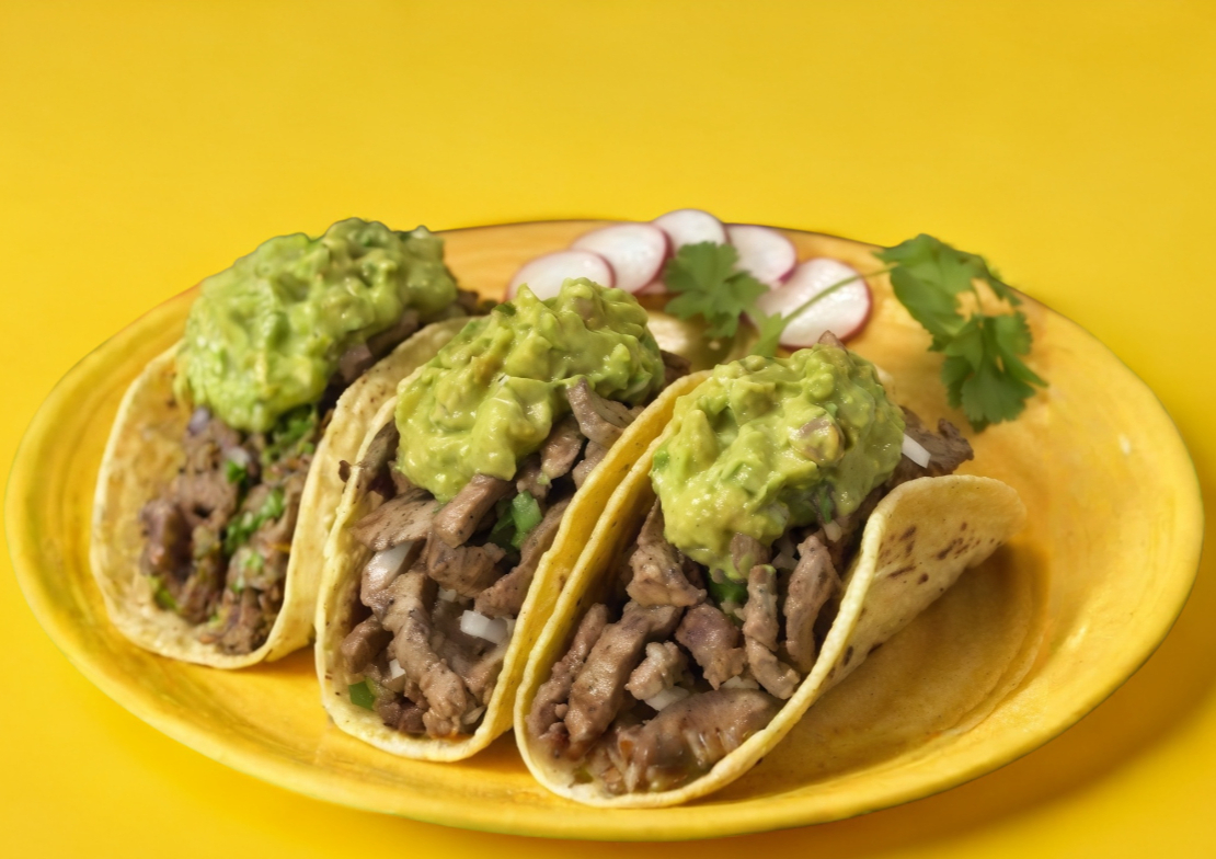 Deliciosa carne de cerdo marinada con receta casera, acompañada de frijol, cebolla blanca, aguacate, salsa de tomate, cilantro hecha en casa y limón.