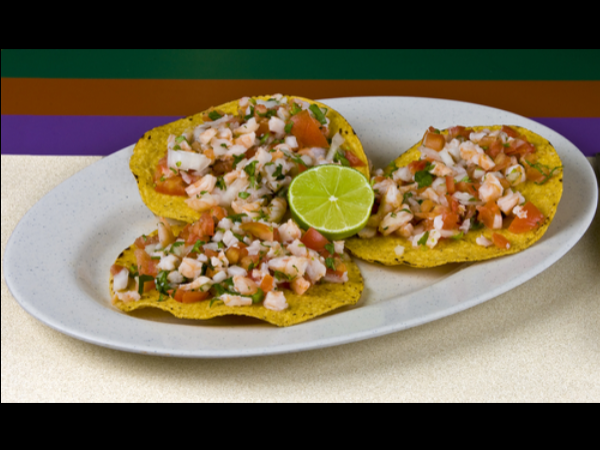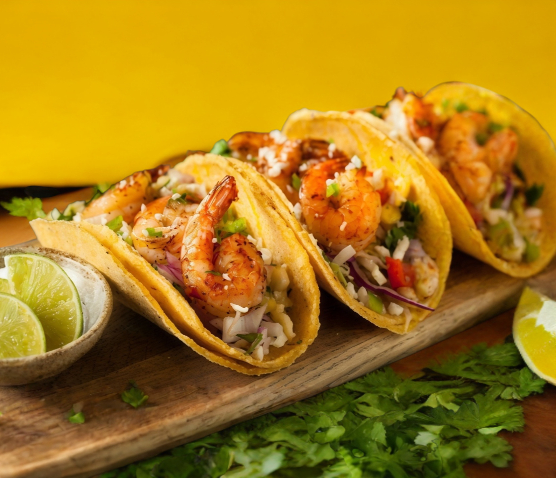 Camarón fresco marinado y frito, lechuga, tomates, pepino, mayonesa, cebolla roja marinada, repollo, aguacate y limón.