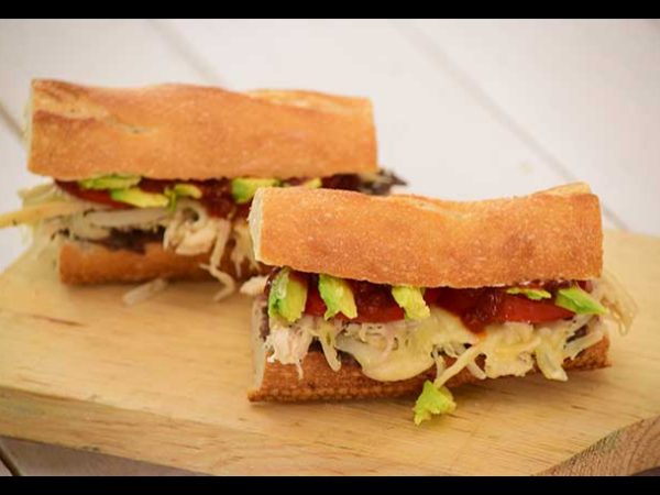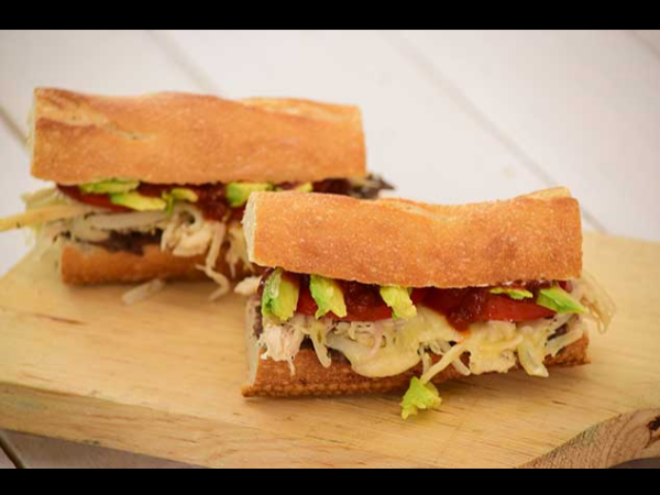 Pan de leña, acompañado de nuestra rica pierna horneada y nuestro pavo asado, jamón, queso, mayonesa, mostaza, lechuga, tomate, pepino, aguacate, cebolla marinada.