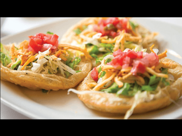 Deliciosos panuchos estilo yucateco, acompañados de lechuga, tomate, repollo, frijol, cebolla roja marinada, aguacate y pepino.