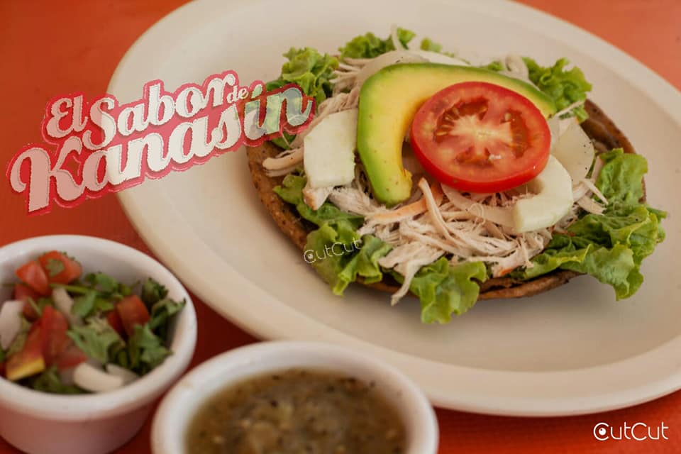Tortilla rellena de frijol frita, preparada con castacan (chicharrón con carne), lechuga, pepino, aguacate, nipec (incluye salsa habanera).