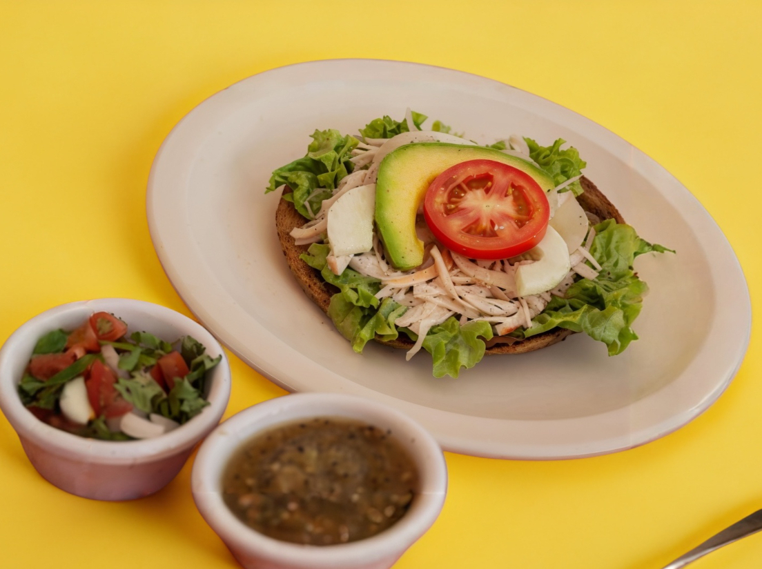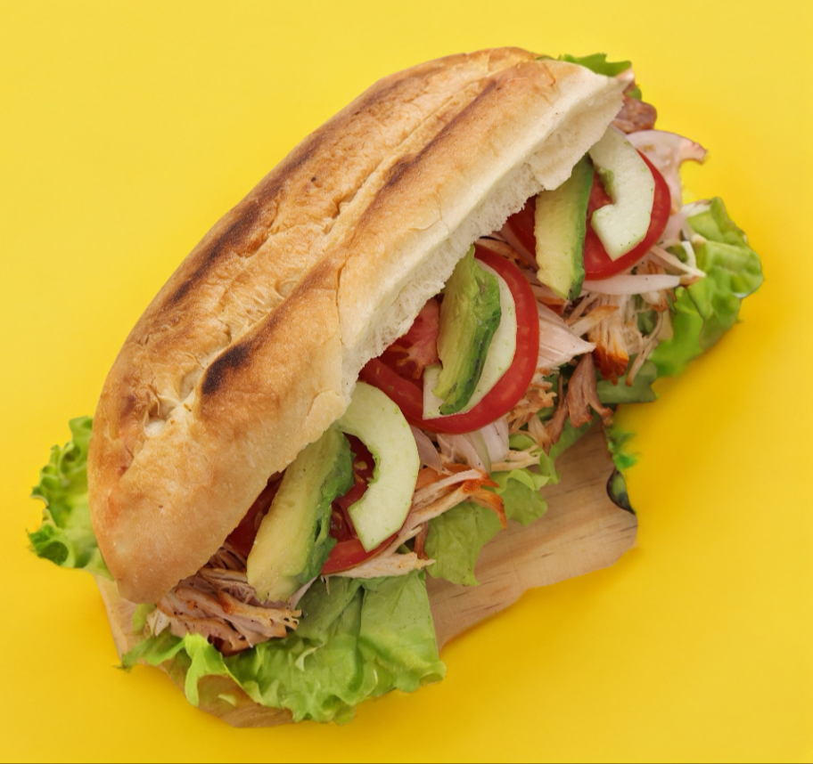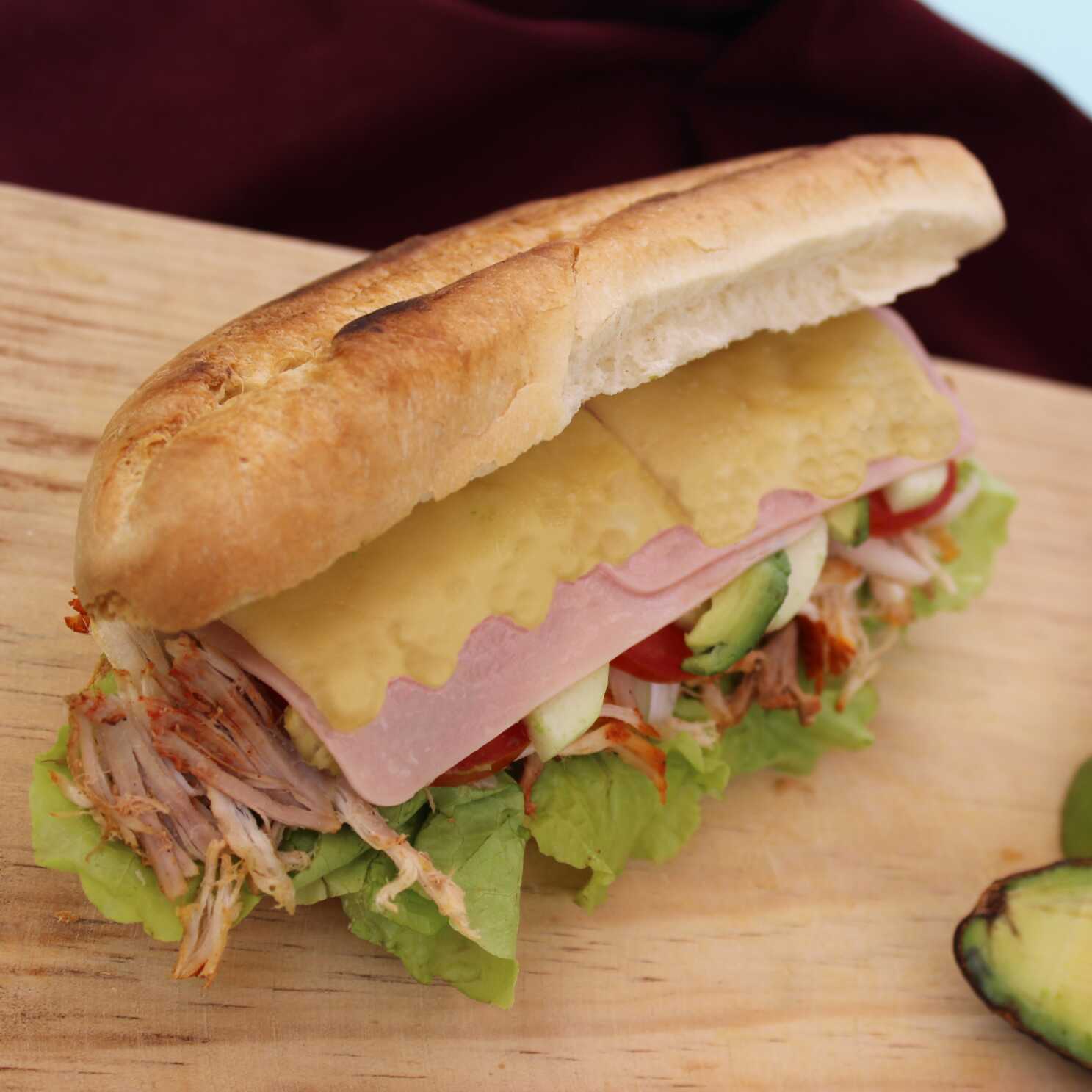 Barra de pan francés de 21 cm aprox. mayonesa, lechuga, pavo, pepino, tomate, aguacate, cebolla en escabeche, jamón y queso gratinado (incluye nipec y salsa habanera).