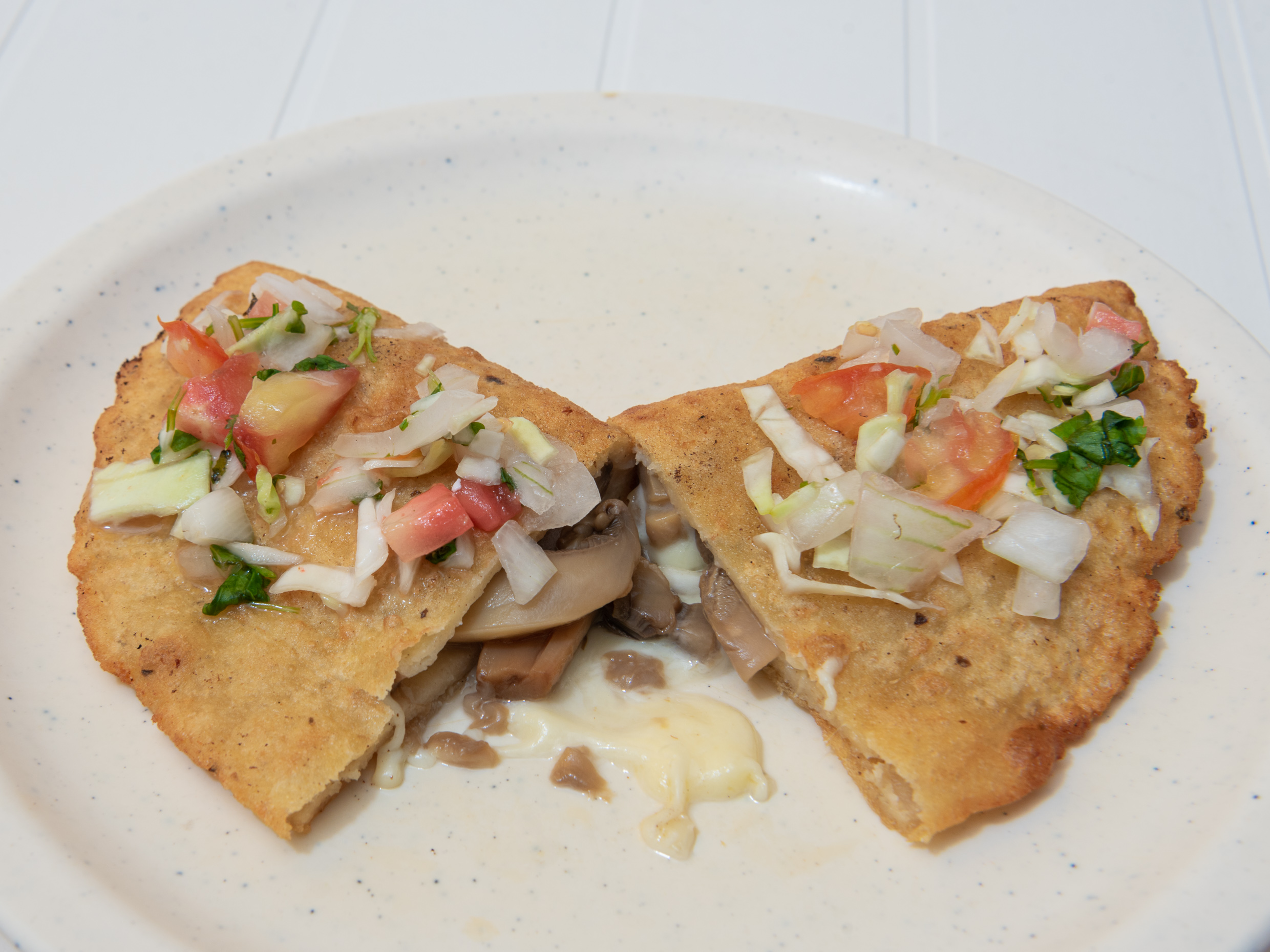 Tortilla rellena de frijol frita, preparada con castacan (chicharrón carnoso de cerdo. ), quezo de bola, lechuga, pico de gallo, pepino, aguacate (incluye nipec y salsa habanera).