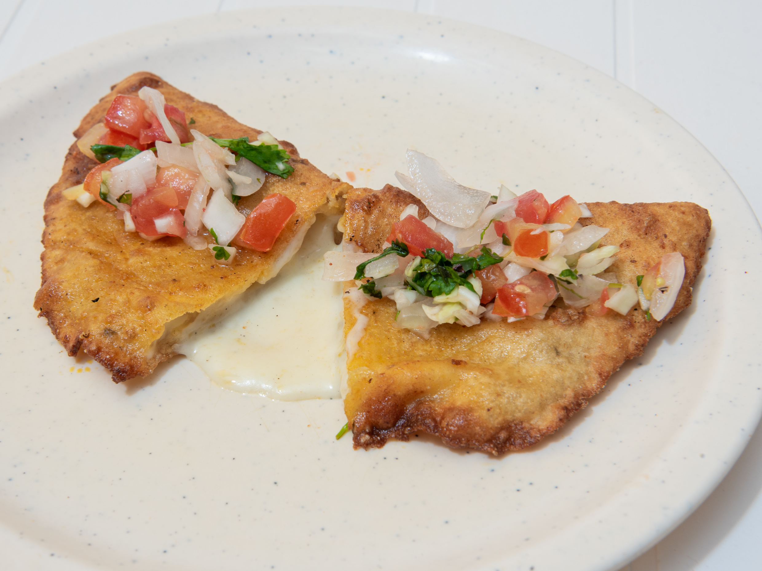 Empanada 20 cm, de queso oaxaca, (incluye cebolla en escabeche, salsa frita, repollo y salsa habanera).