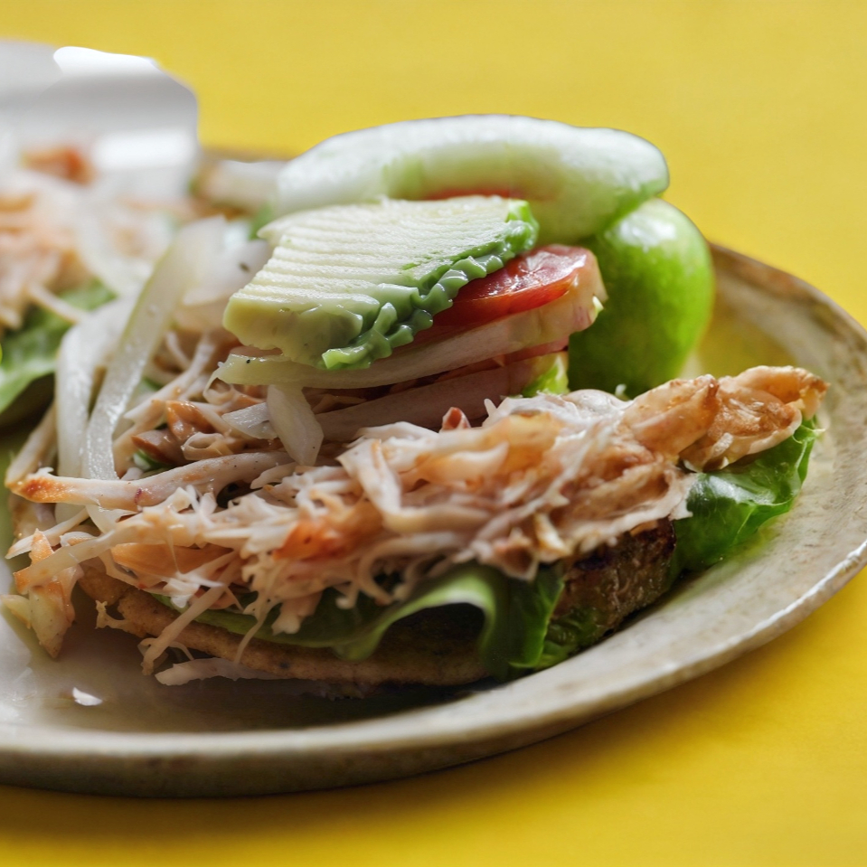 Fritura suave de maíz, lechuga, pavo, cebolla en escabeche, pepino, tomate, aguacate.