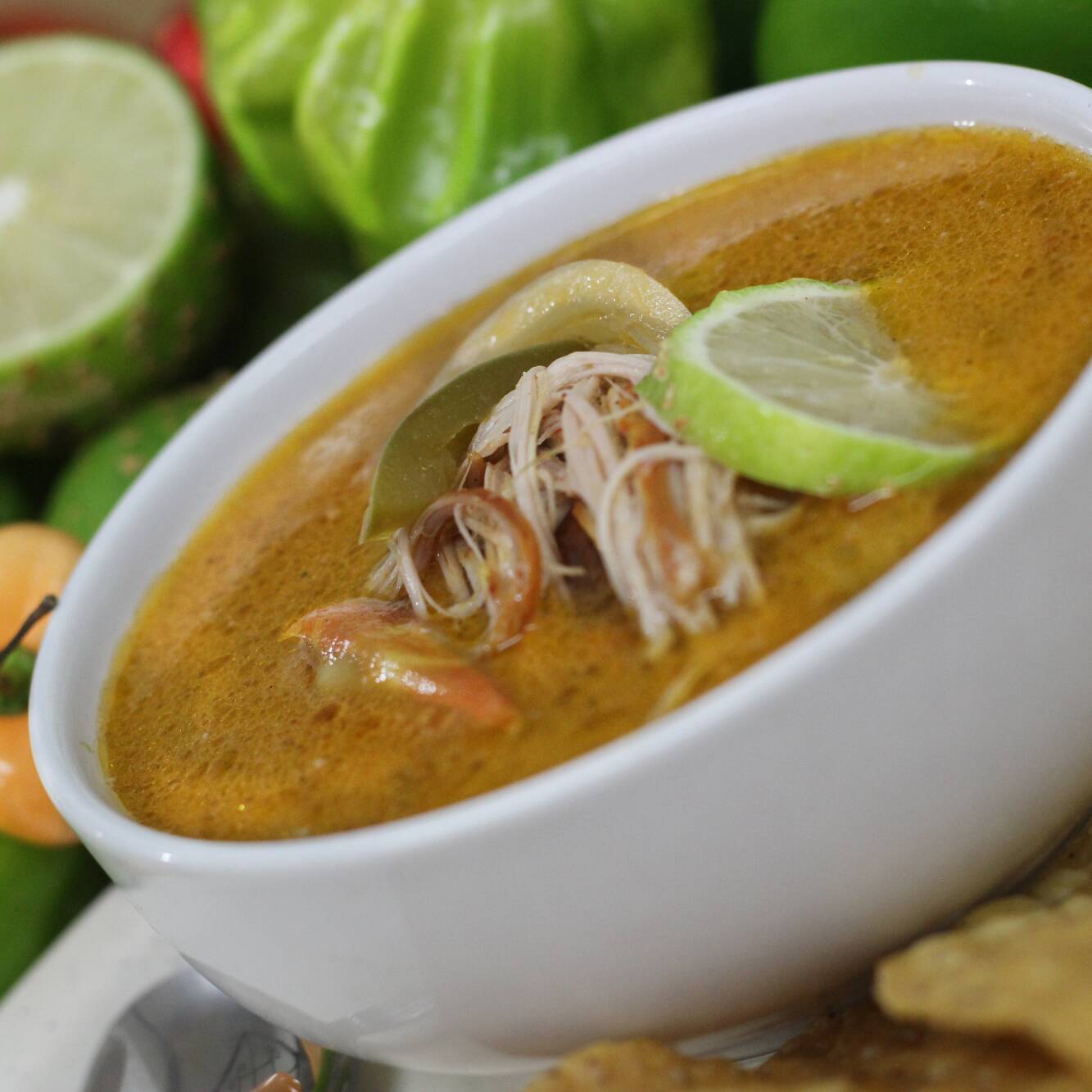 Un litro caldo de pavo, sofrito de cebolla, tomate y pimiento, jugo de lima, 100g de carne de pavo, tostadas, picante y nipec.