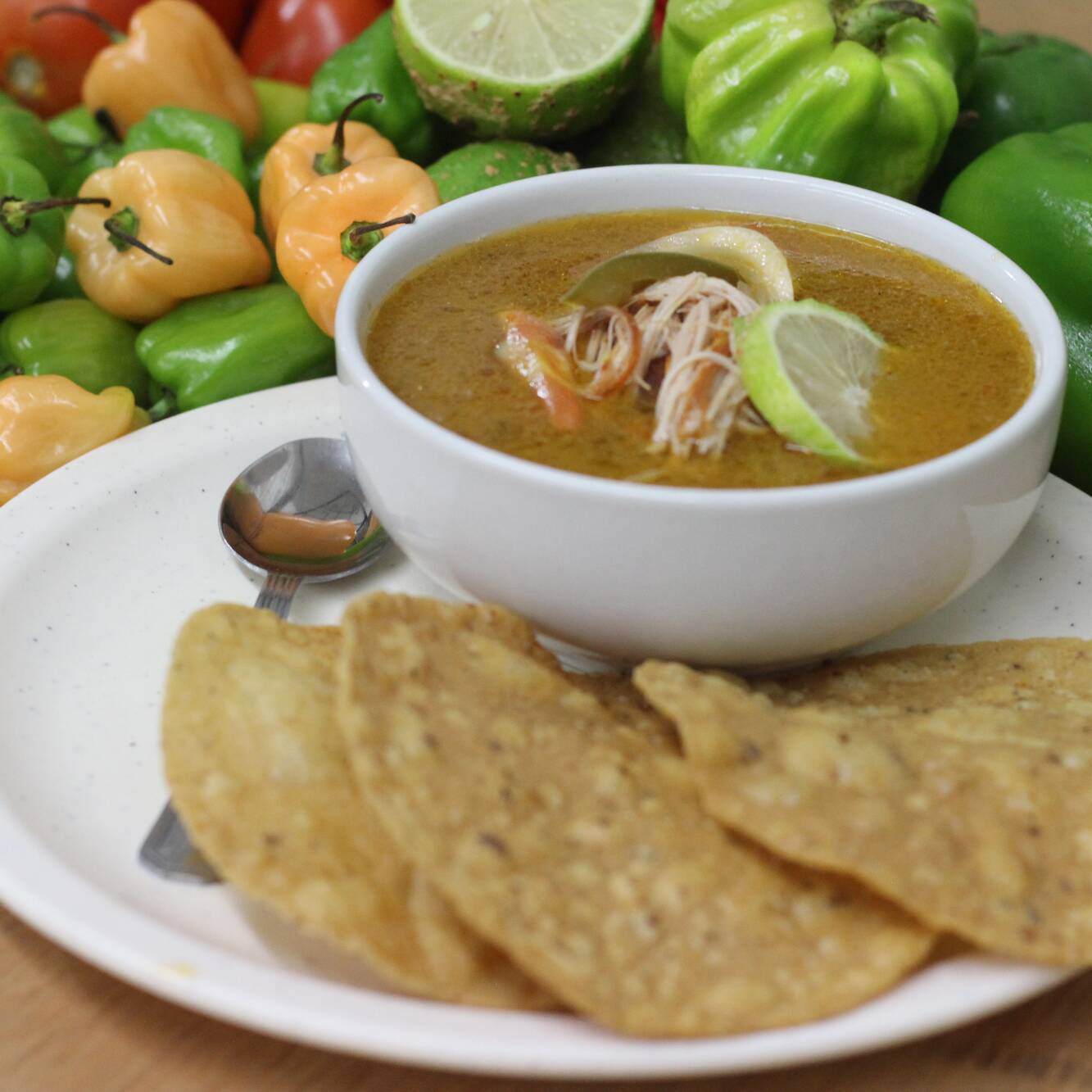 Caldo de pavo ( 800 mililitros) carne de pavo 50 gr. , incluye servido aparte. Tostadas, limón o lima, picante, nipec.
