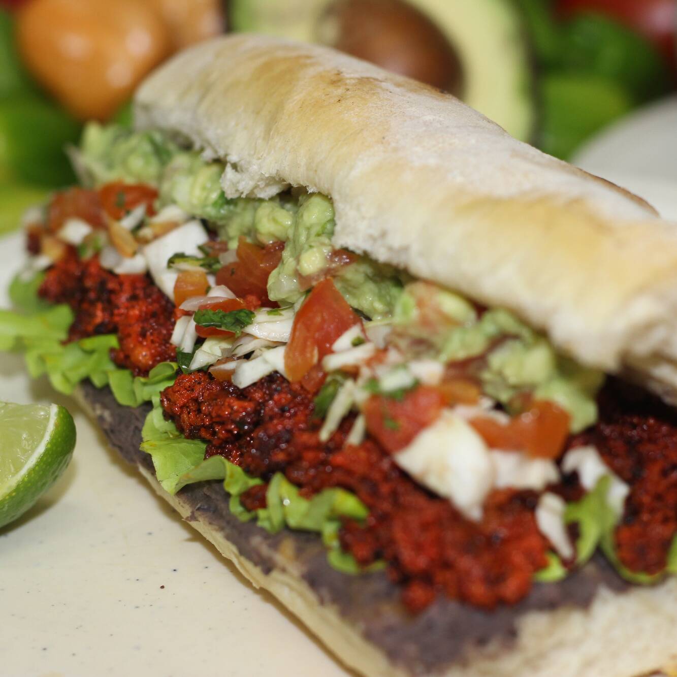 20 cm de pan francés, frijol, lechuga, longaniza frita, pico de gallo, pepino, guacamole.