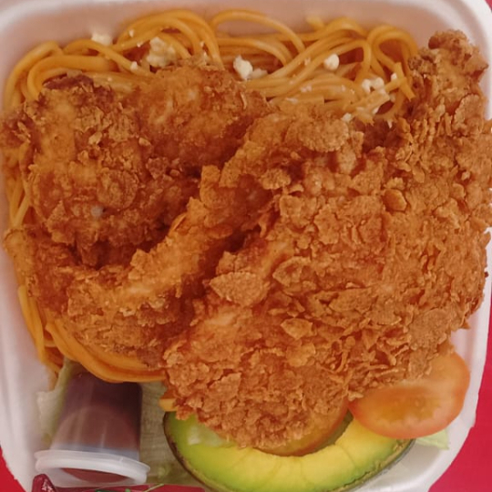 3 PIEZAS DE PECHUGA CRISPY, ACOMPAÑADO DE SPAGUETTI, PAPAS A LA FRANCESA, FRIJOL Y TORTILLAS
