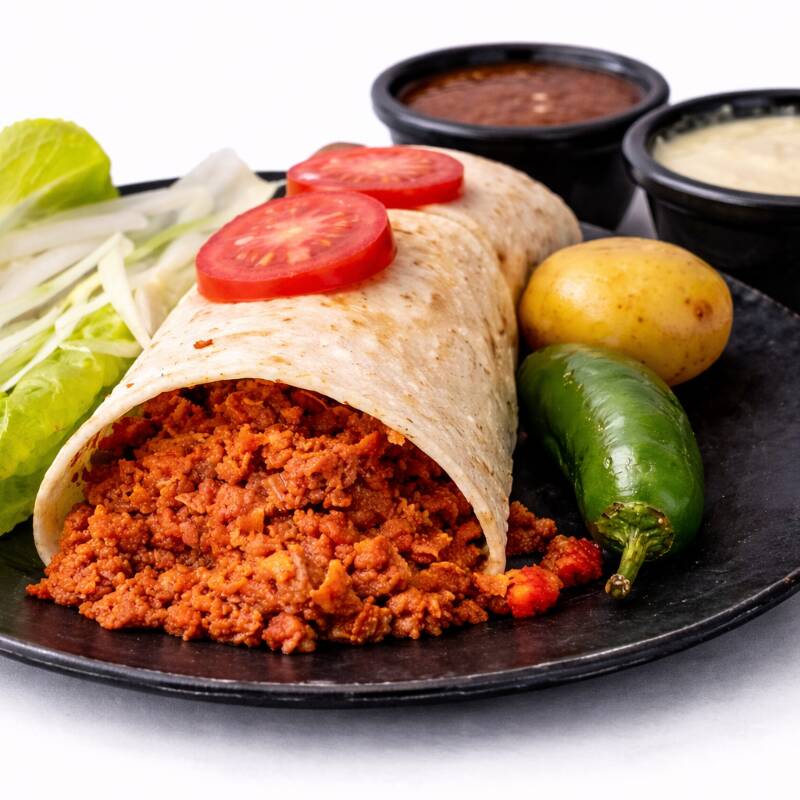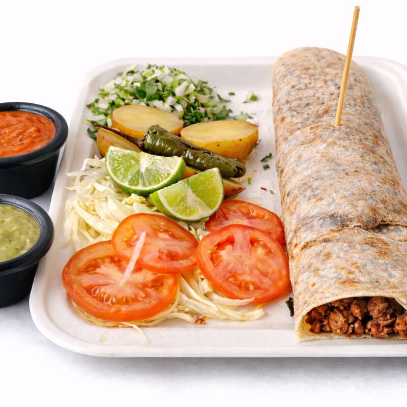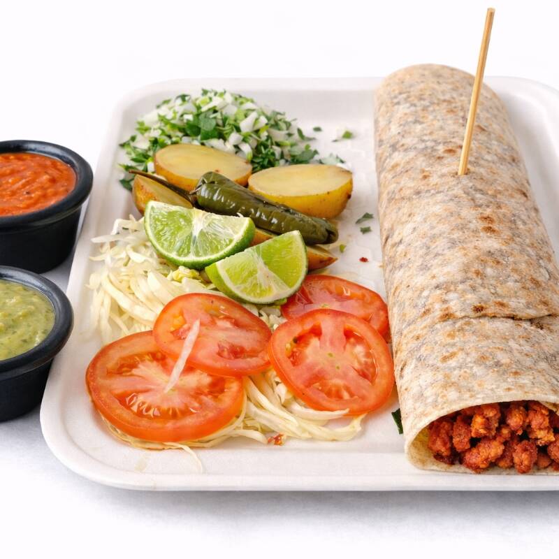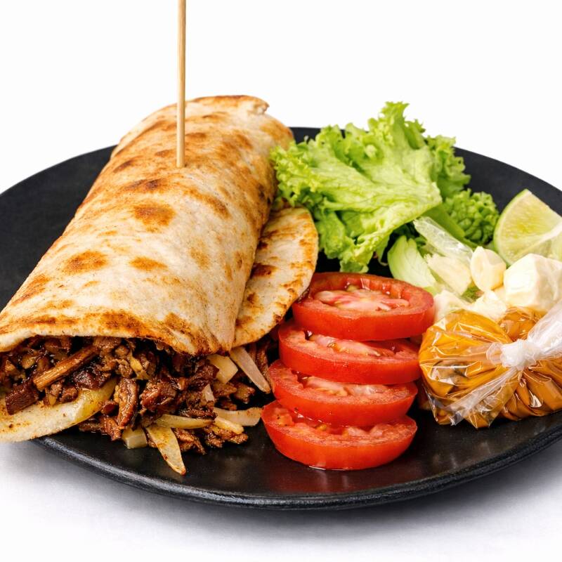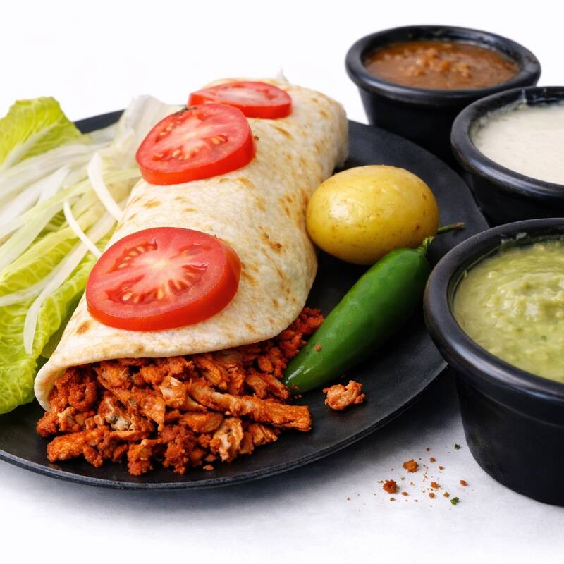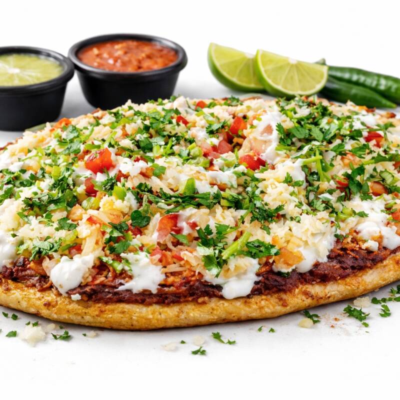 Elaborado con tortilla de harina, frijol, lechuga Italiana, jitomate, carne al pastor, cebolla, cilantro, queso rayado fundido, se acompaña con limones, salsa de guacamole, salsa Ranchera, crema xcatic, papas cambray y chile serrano.