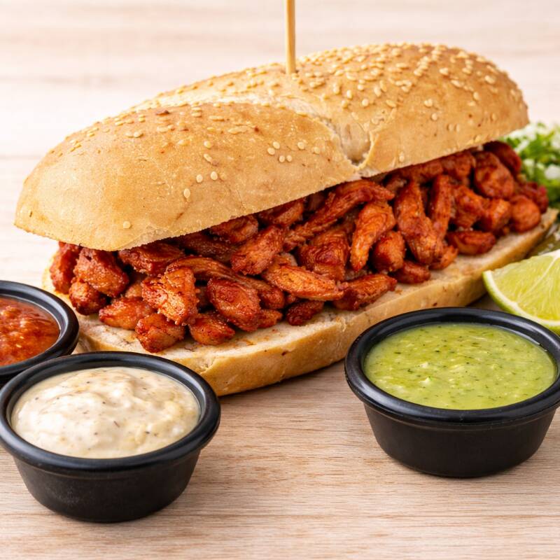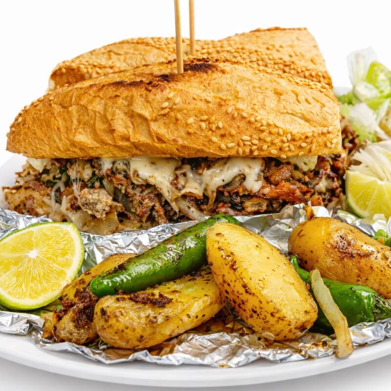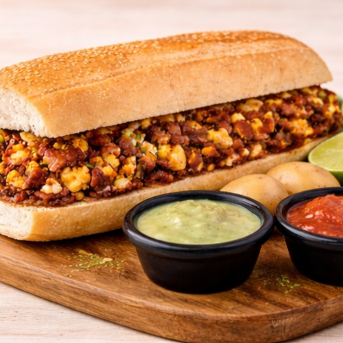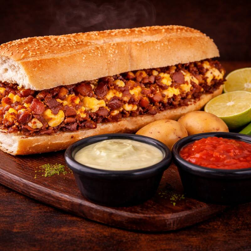 Pan Baguette con ajonjolí, capa de frijol, carne asada de cerdo, longaniza ahumada, cebolla asada, queso fundido de alta calidad, cilantro, se acompaña con papas cambray al estilo chino, chile serrano, limón, salsa de tomate, guacamole y crema xcatic.