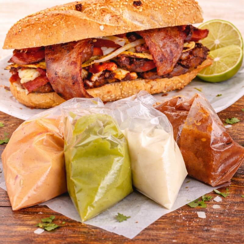Frijol, mayonesa, jamón, salchichas, jitomate, lechuga, cebolla asada, queso fundido tocineta y longaniza se acompaña con salsas, chile serrano y limón.