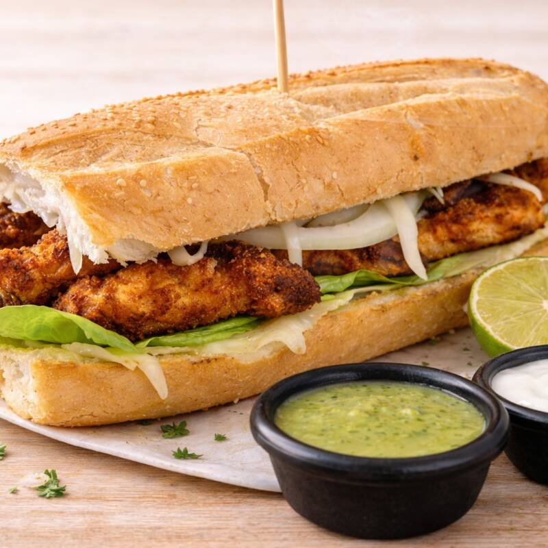 Pollo crujiente, queso fundido, verduras frescas y aderezos. Incluye papas cambray y salsas.