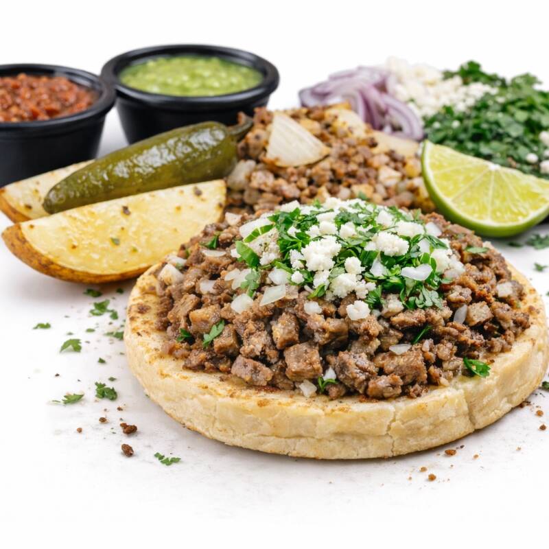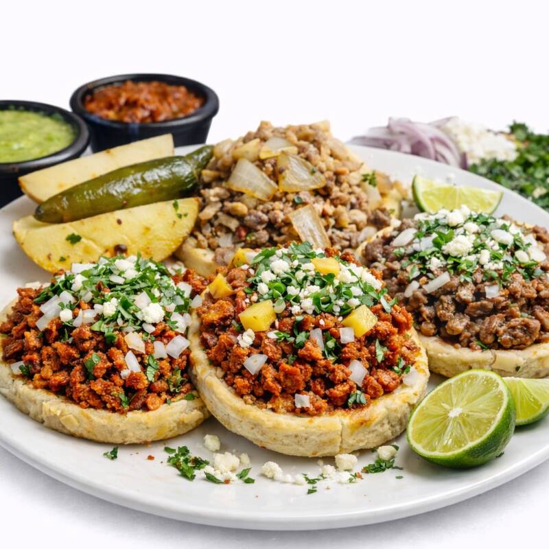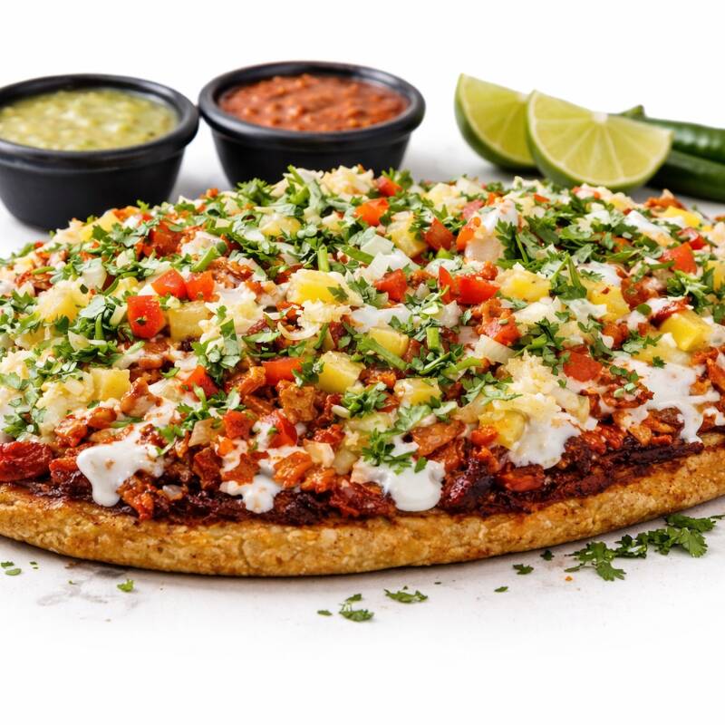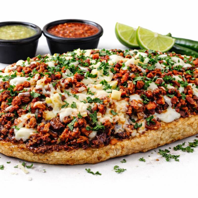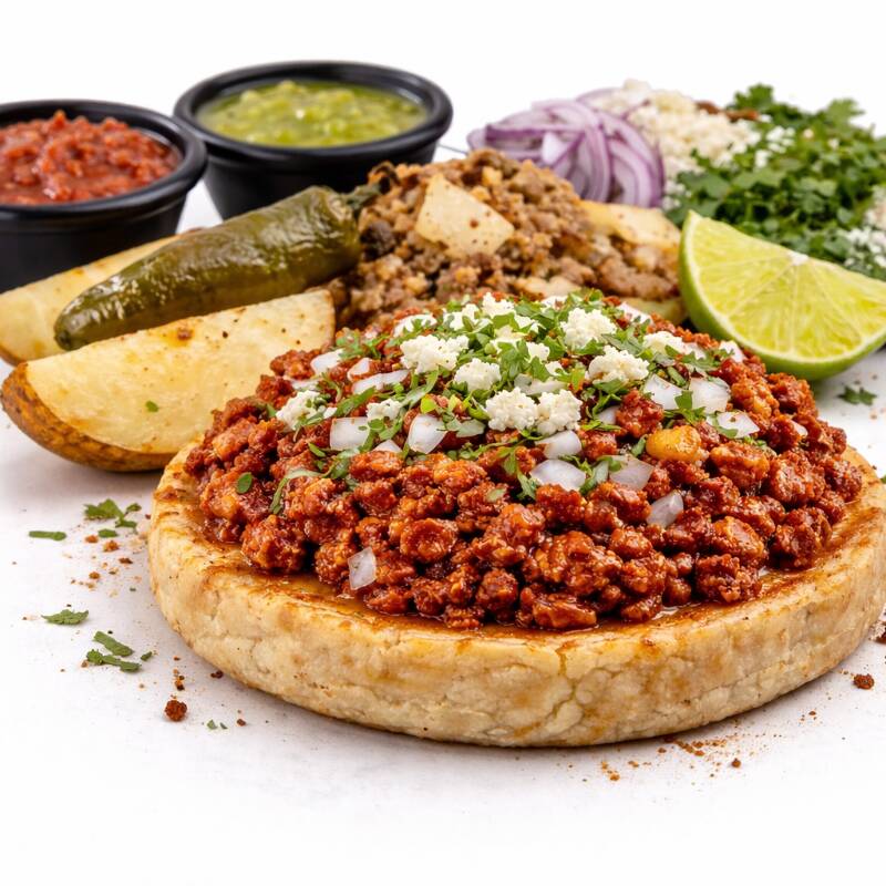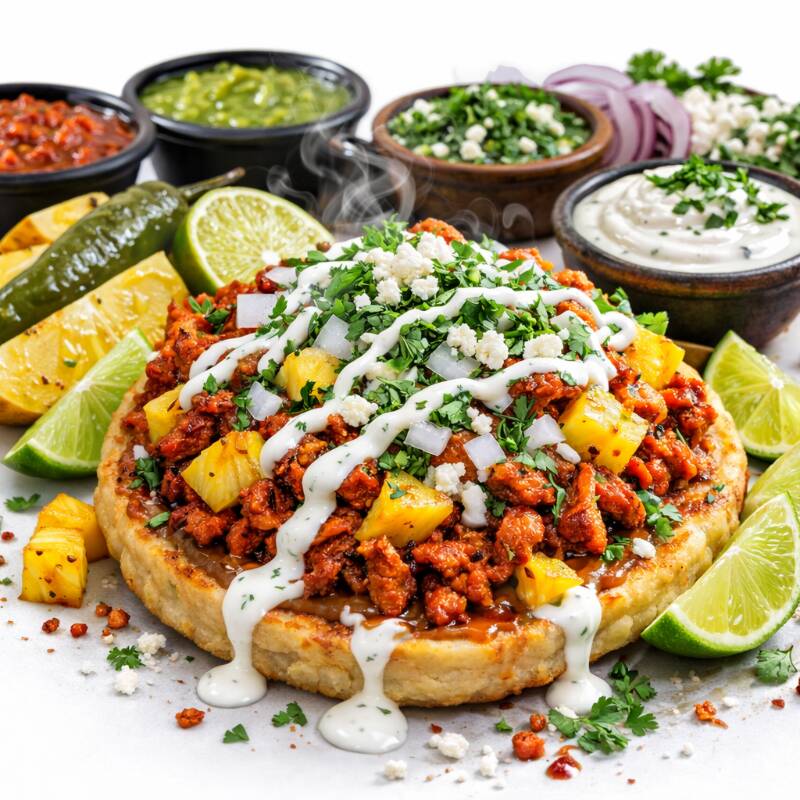 Elaborado con frijol refrito, carne al pastor, cebolla, cilantro, queso rayado fundido y se acompaña con papas cambray, chile serrano, crema xcatic, salsa Ranchera, guacamole y limón.