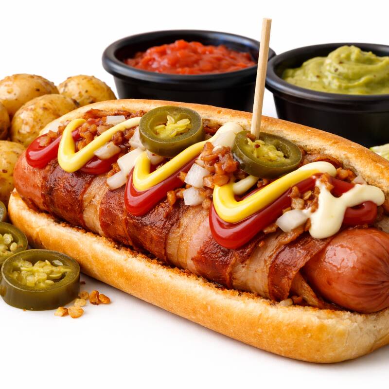 Salchicha envuelta en tocino, cebolla, salsas y papas cambray