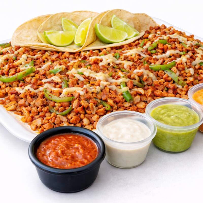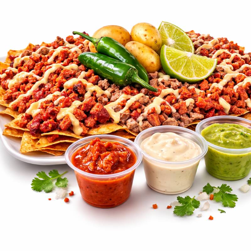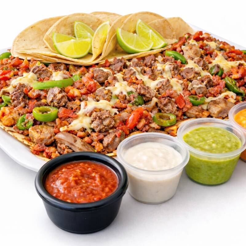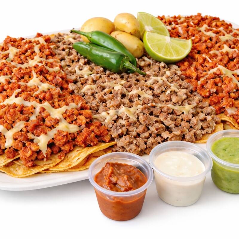 Elaborado a base de frijol, totopos, carne al pastor, cebolla y cilantro, queso fundido de alta calidad, salsa de tomate, guacamole, crema xcatic, papas cambray al estilo chino, chile serrano y limón.
