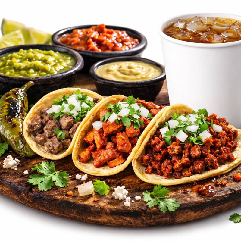 Tortilla caliente con carne asada bien doradita y jugosa, acompañada de cebolla, cilantro y nuestras salsas de la casa.