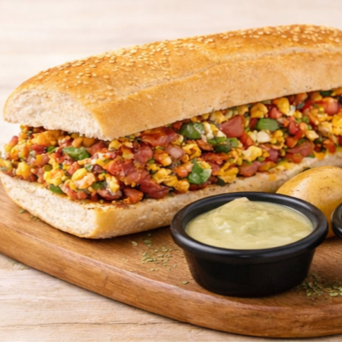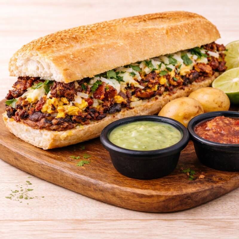Elaborada con pan baguet con ajonjolí, capa de frijol, huevos revueltos, tocino, queso fundido de alta calidad, se acompaña con papas cambray al estilo chino, chile serrano, salsa de tomate, guacamole y crema xcatic.