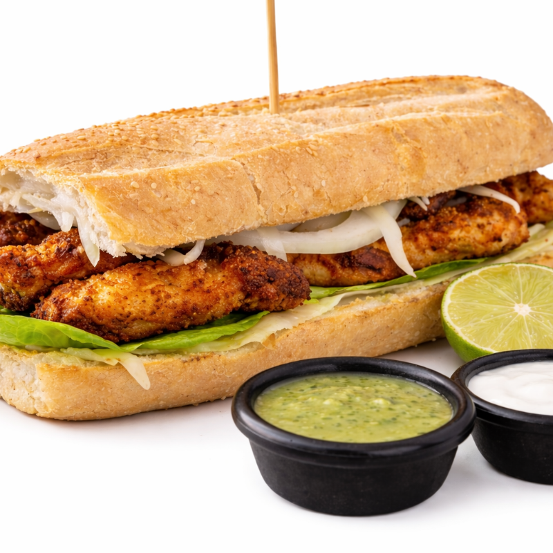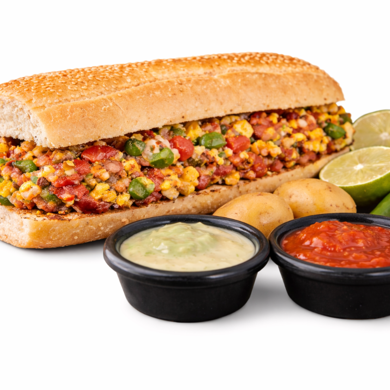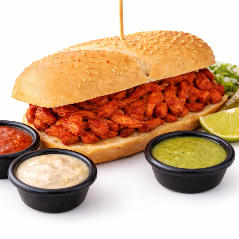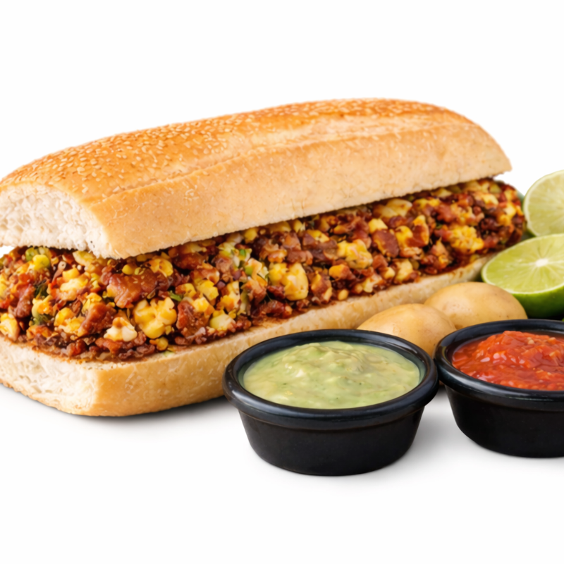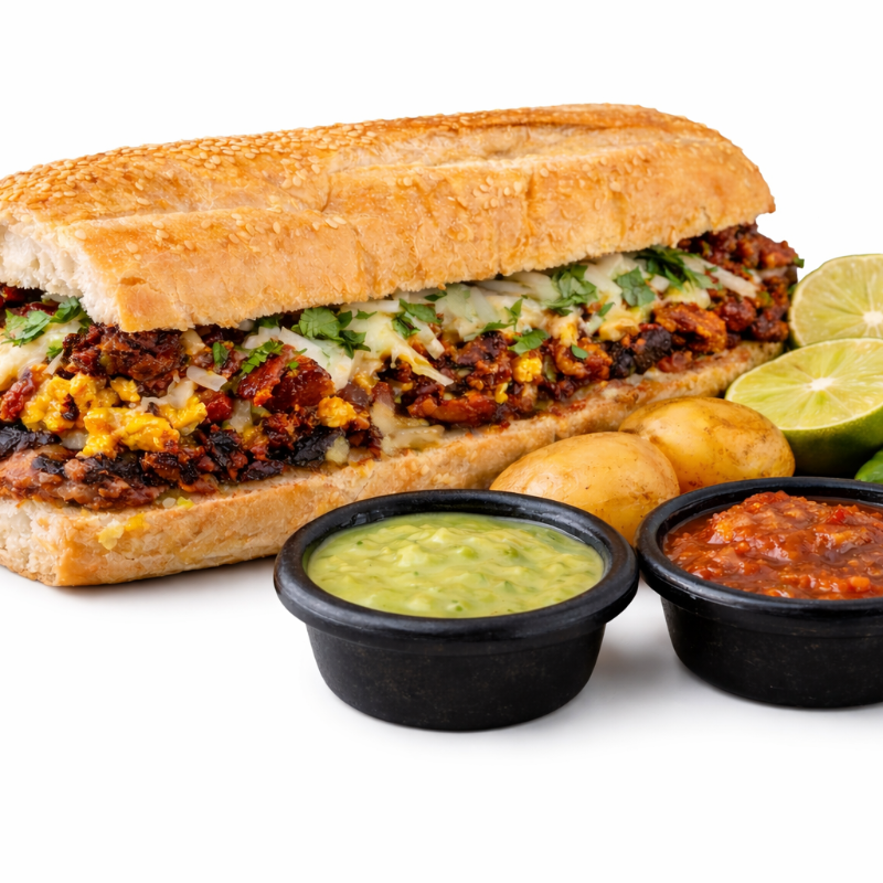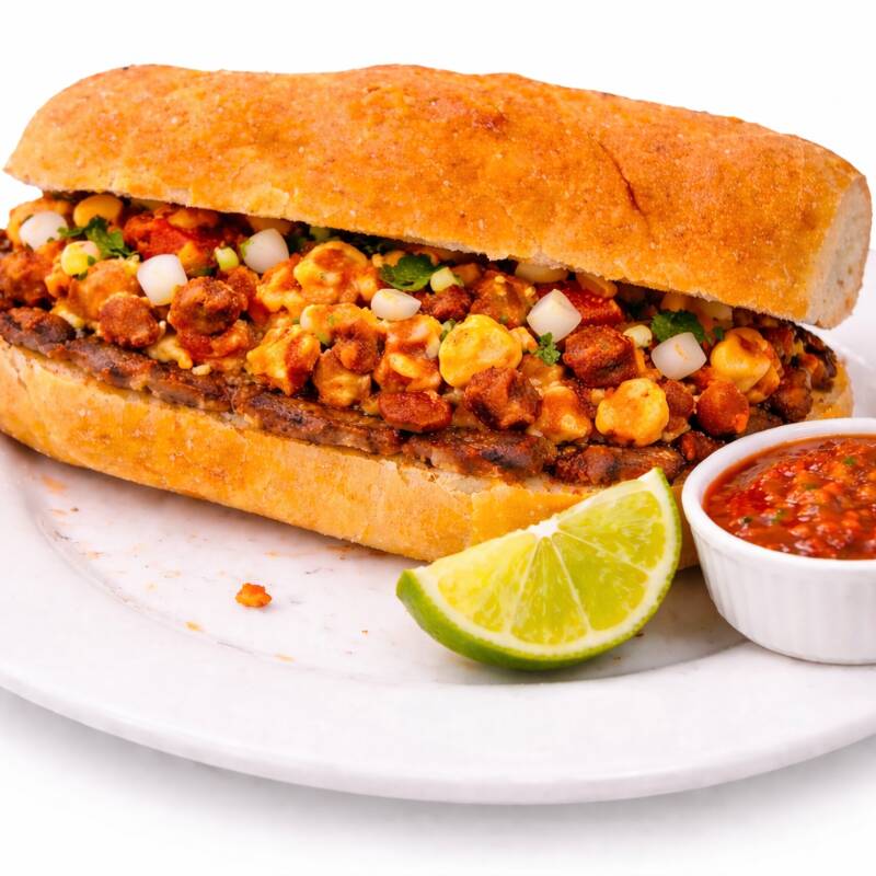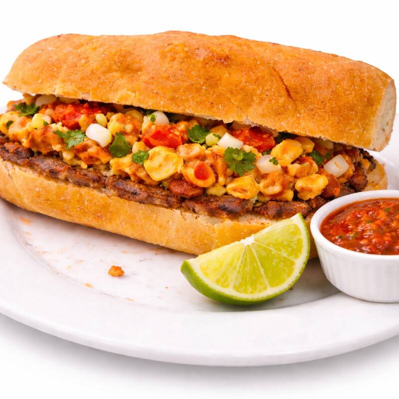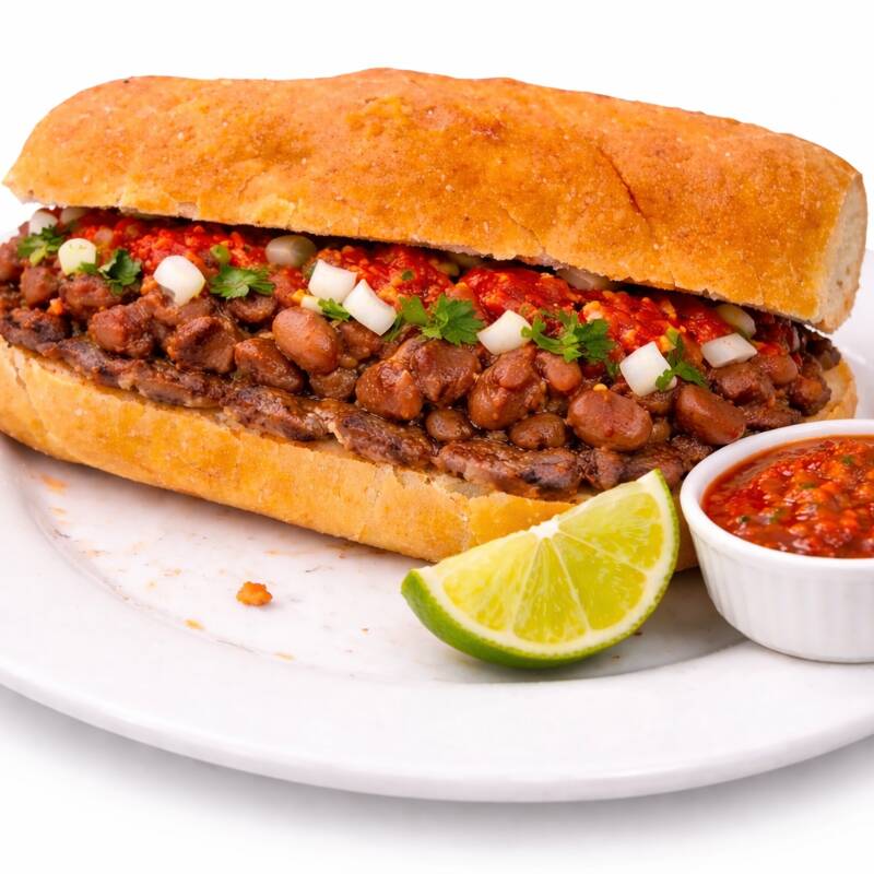 Deliciosa torta en pan francés dorado, rellena de carne asada bien sazonada a la parrilla, frijoles, cebolla y cilantro fresco. Incluye limón y salsa roja aparte para un toque irresistible.