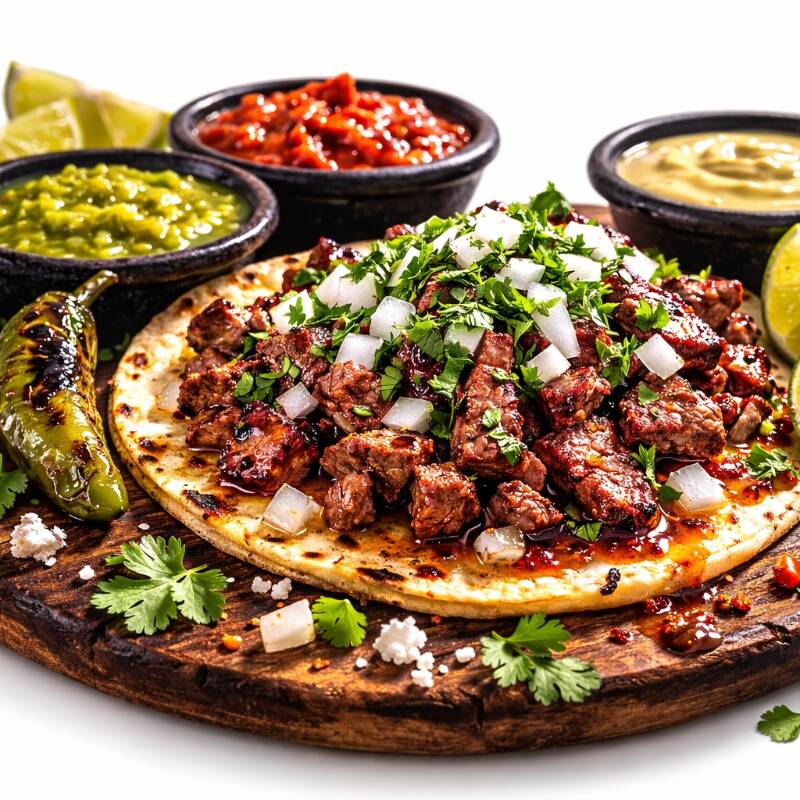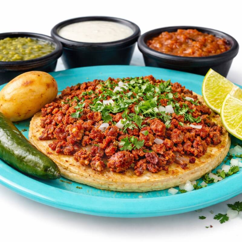 Carne de tu elección acompañado de queso fundido,cebolla, cilantro, chile serrano, limón y papas cambray