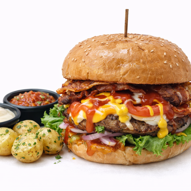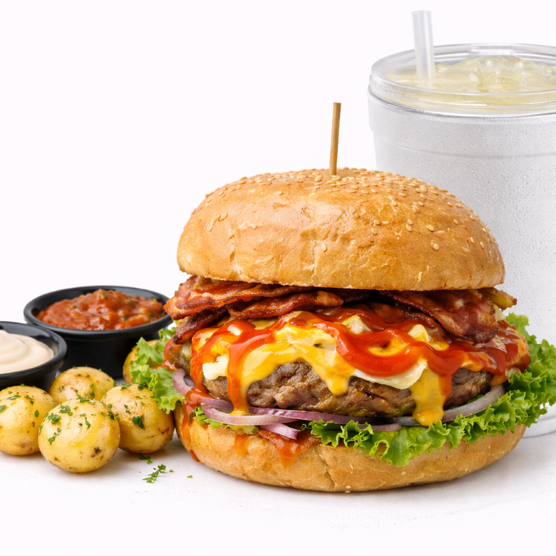 Hamburguesa elaborada con carne de Sirloin (entraña fina),un corte tierno y lleno de sabor. Servida en pan artesanal con queso, vegetales frescos y salsas al gusto.
