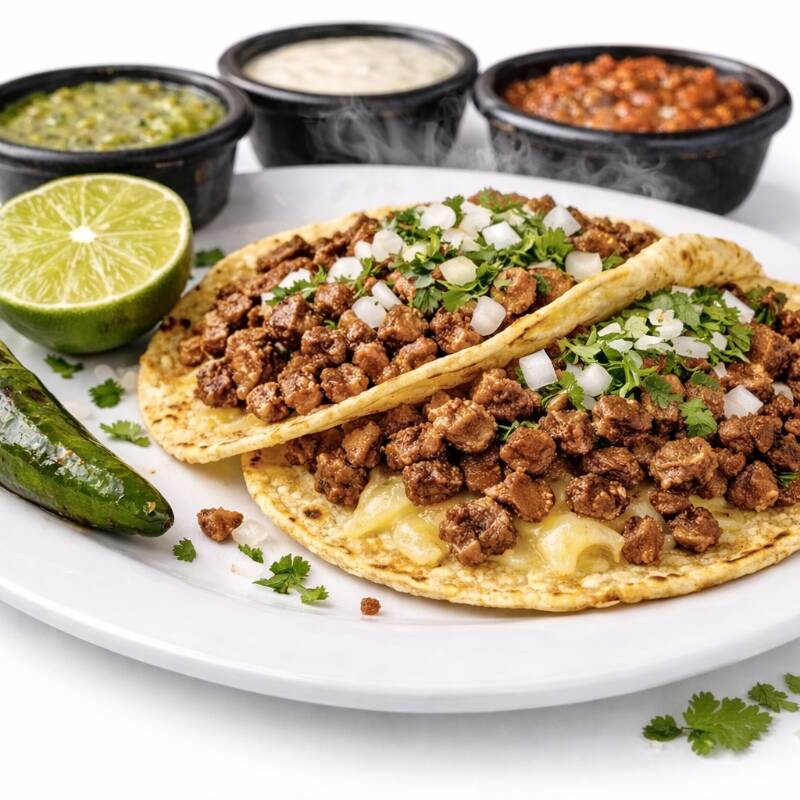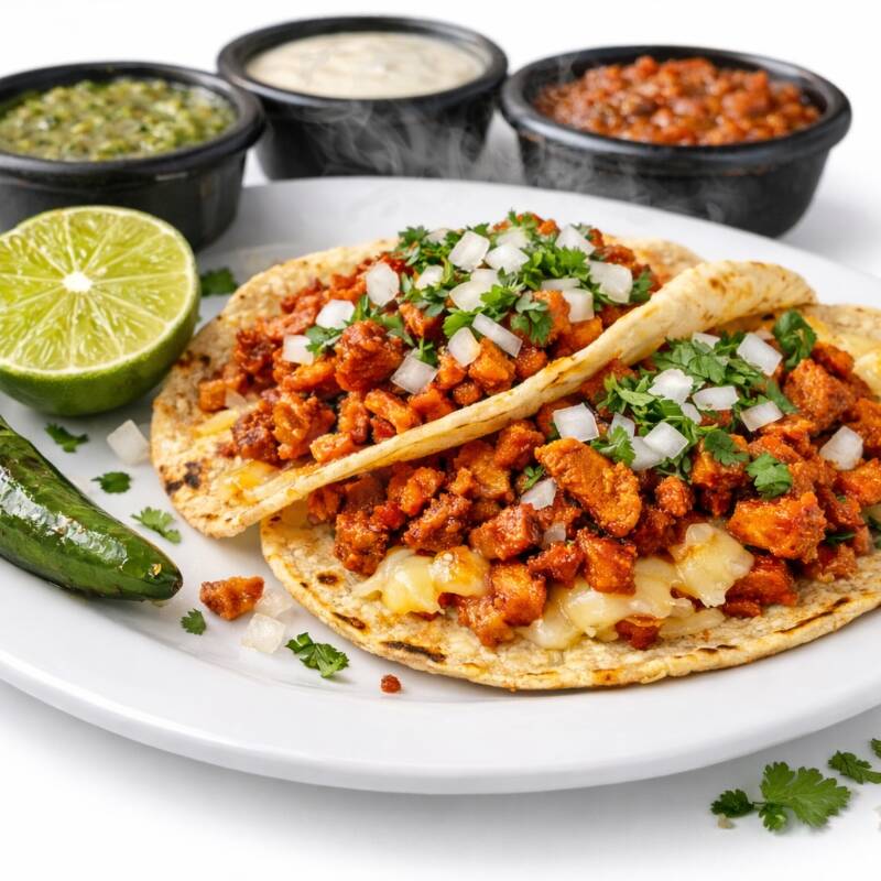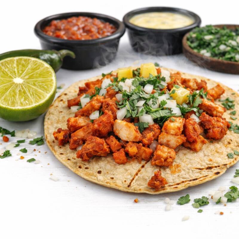 Taco de doble tortilla con carne al pastor, cebolla, cilantro, salsas, limón y chile serrano.