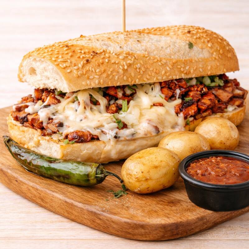 Pan Baguette con ajonjolí, capa de frijol, carne asada de cerdo, queso fundido de alta calidad, cebolla asada, se acompaña con papas cambray al estilo chino, chile serrano, salsa de tomate, guacamole y crema xcatic.