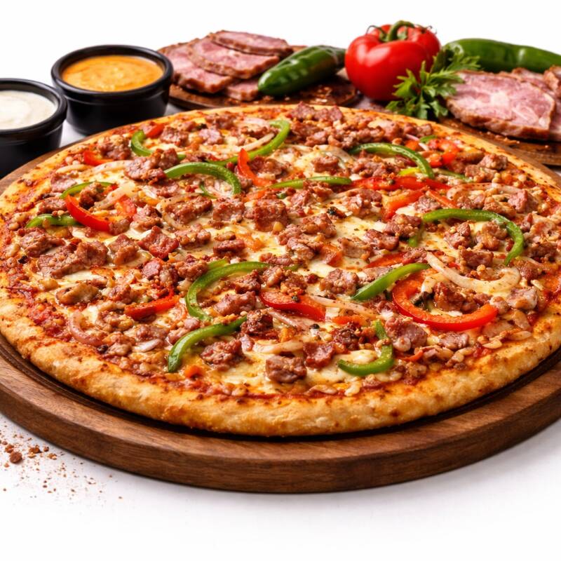 Elaborada con salsa Italiana, queso fundido de alta calidad, chuleta de cerdo, chile morron, cebolla asada, tocineta, queso extra, se acompaña de salsa de tomate, guacamole y crema xcatic.