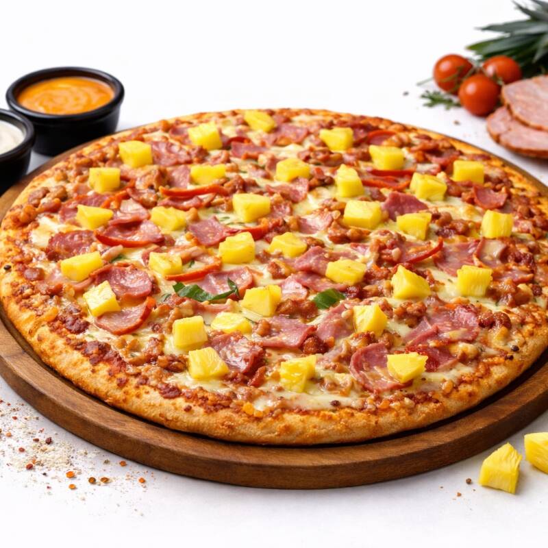 Elaborada con salsa Italiana, jamón, queso fundido de alta calidad, trozos de piña, se acompaña con salsa de tomate y crema xcatic.