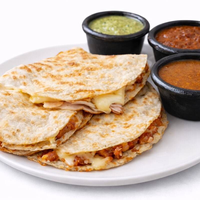 Tortillas de harina con jamón de pavo y queso gouda fundido, acompañado de crema xcatic, chimichurri y salsa roja.
