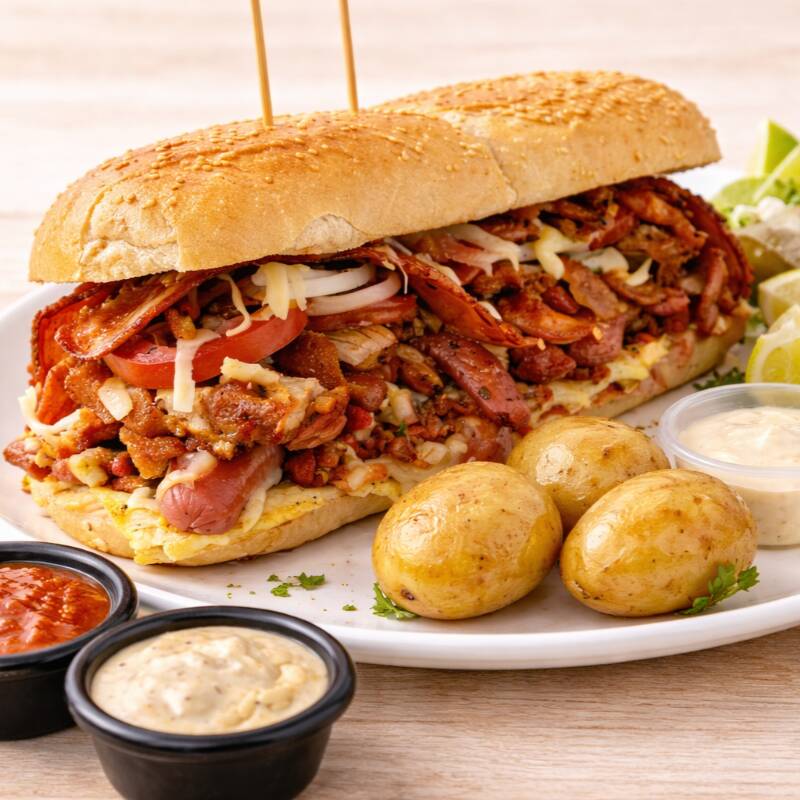 🔥 Nuestra torta más grande y completa: carne asada, pastor, longaniza, empanizado, tocino, salchicha, queso fundido y más. Incluye papas cambray y 3 salsas.“⚠️ Porción grande / recomendada para compartir”