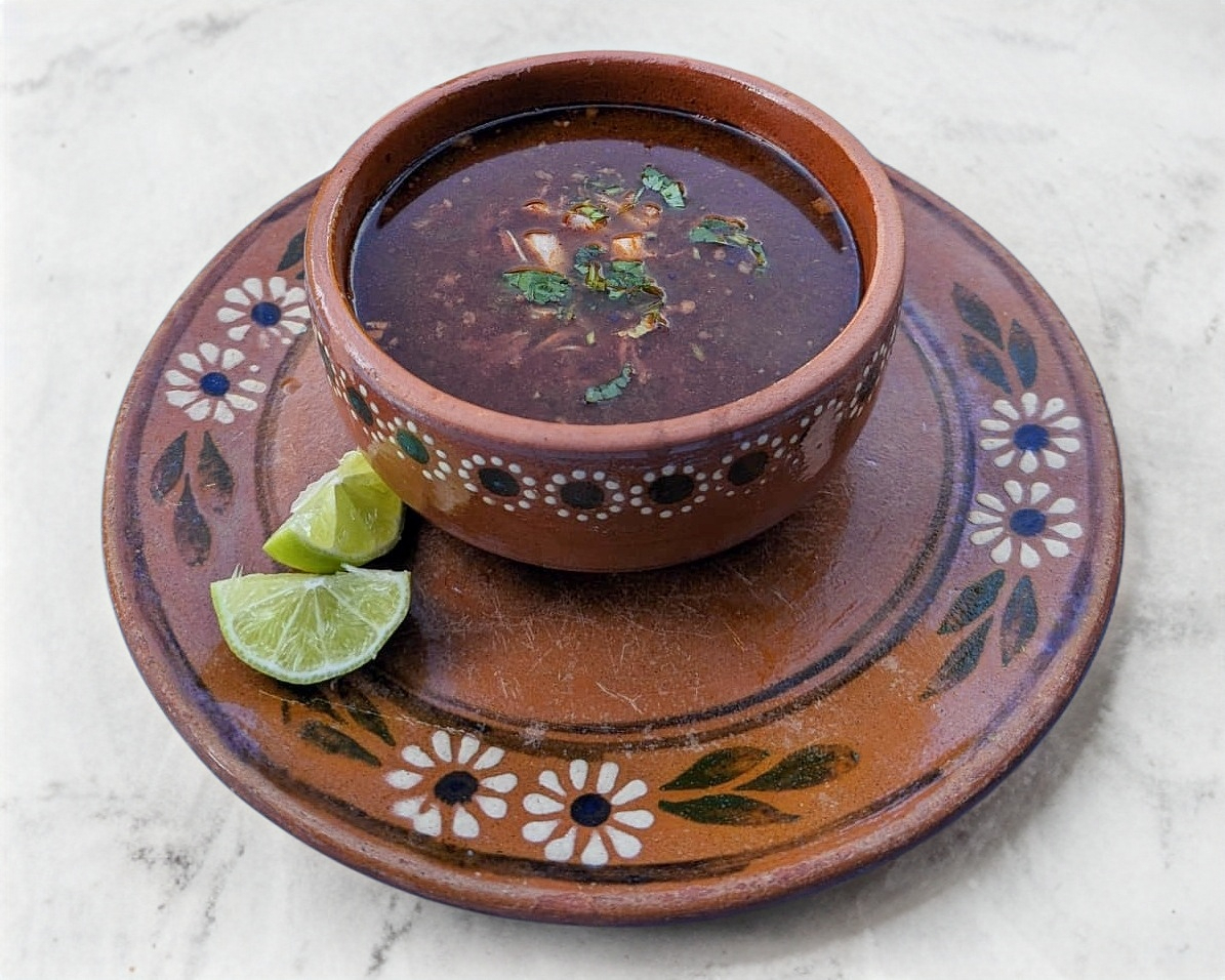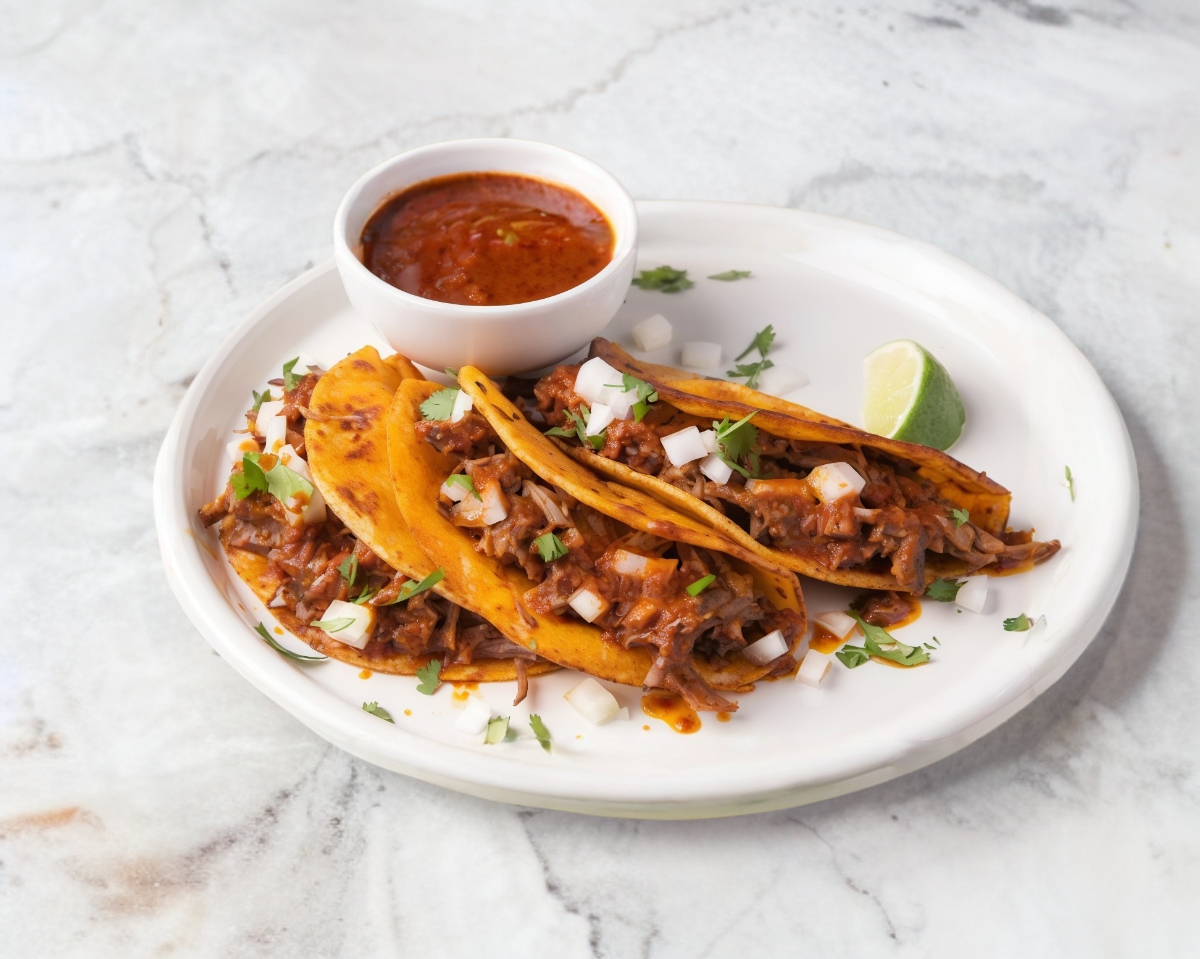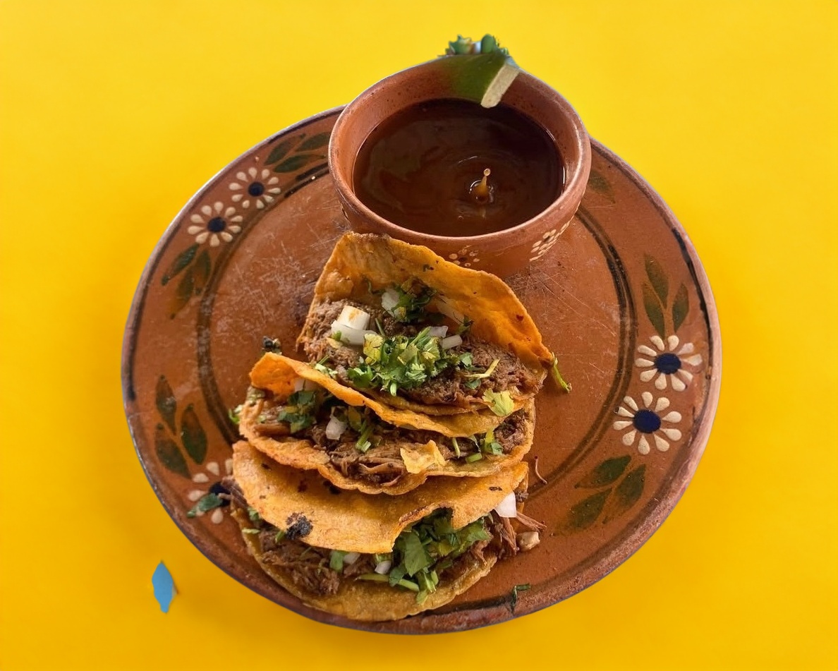 Relleno de carne de birria en consomé, tortilla de maíz.
