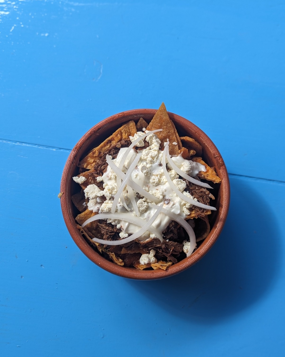 Totopos en caldo de birria, carne desmenuzada, queso, cebolla y crema.