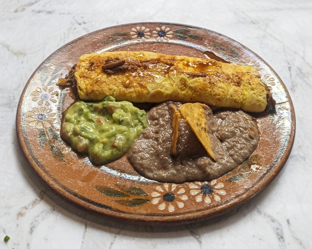 Omelette con birria y queso, frijoles y guacamole.