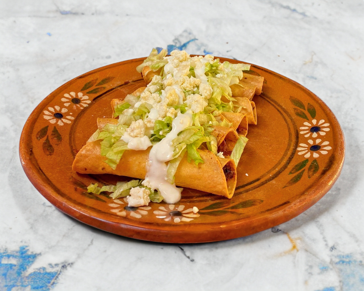 6 flautas rellenas de carne de res de birria, bañado en salsa de birria , acompañado de lechuga, queso doble crema y crema