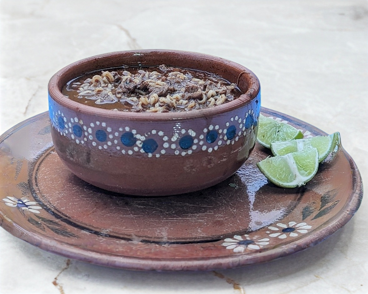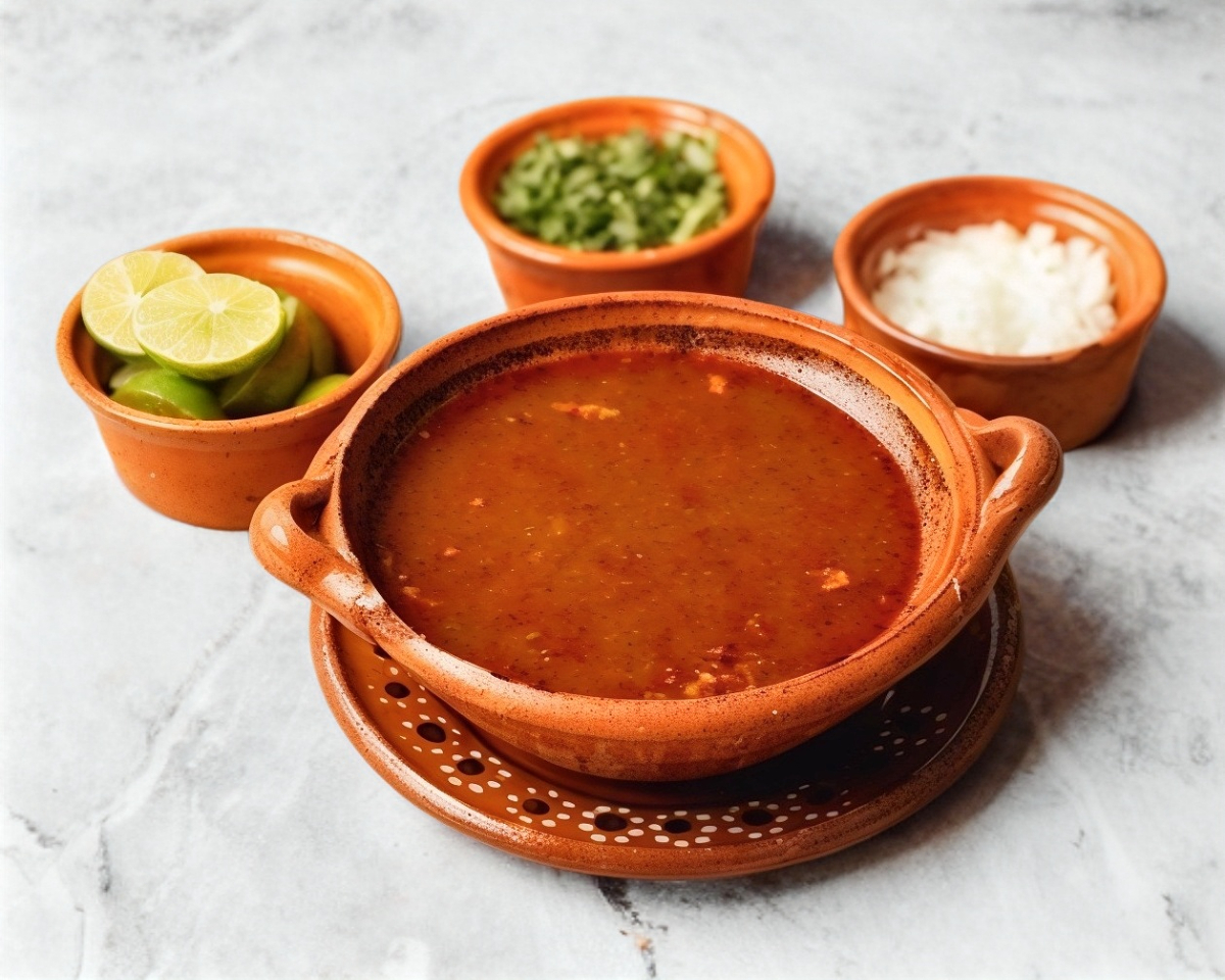 Caldo de chiles y especias con carne, opción de arroz.