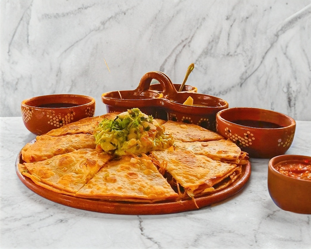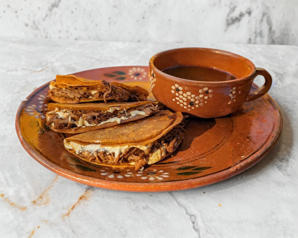 3 Quesadillas de birria con consomé y bebida.