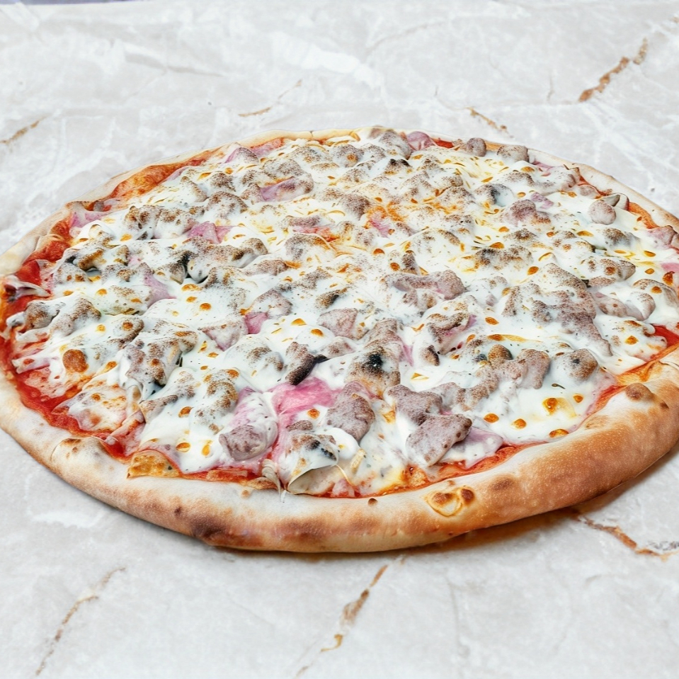 Deliciosa pizza con jamón, salami y queso.