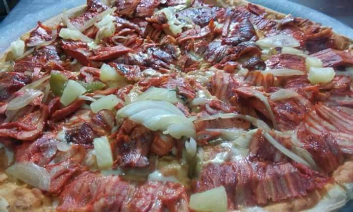salsa de pizza, queso, carne, pimienta morrón, y piña 12 rebanadas. Maximo para 4 personas