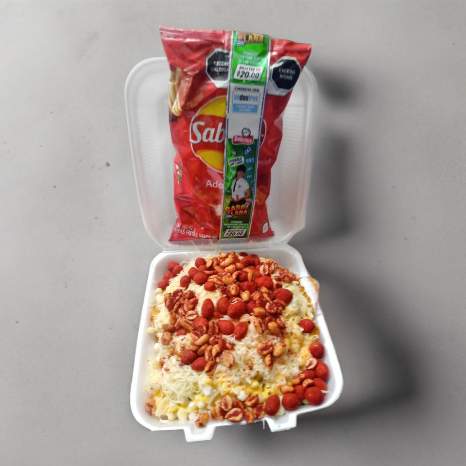 Dos elotes a la mitad con crema y queso, SABRITA,esquite un toping,crema, queso para nachos y queso gouda rallado