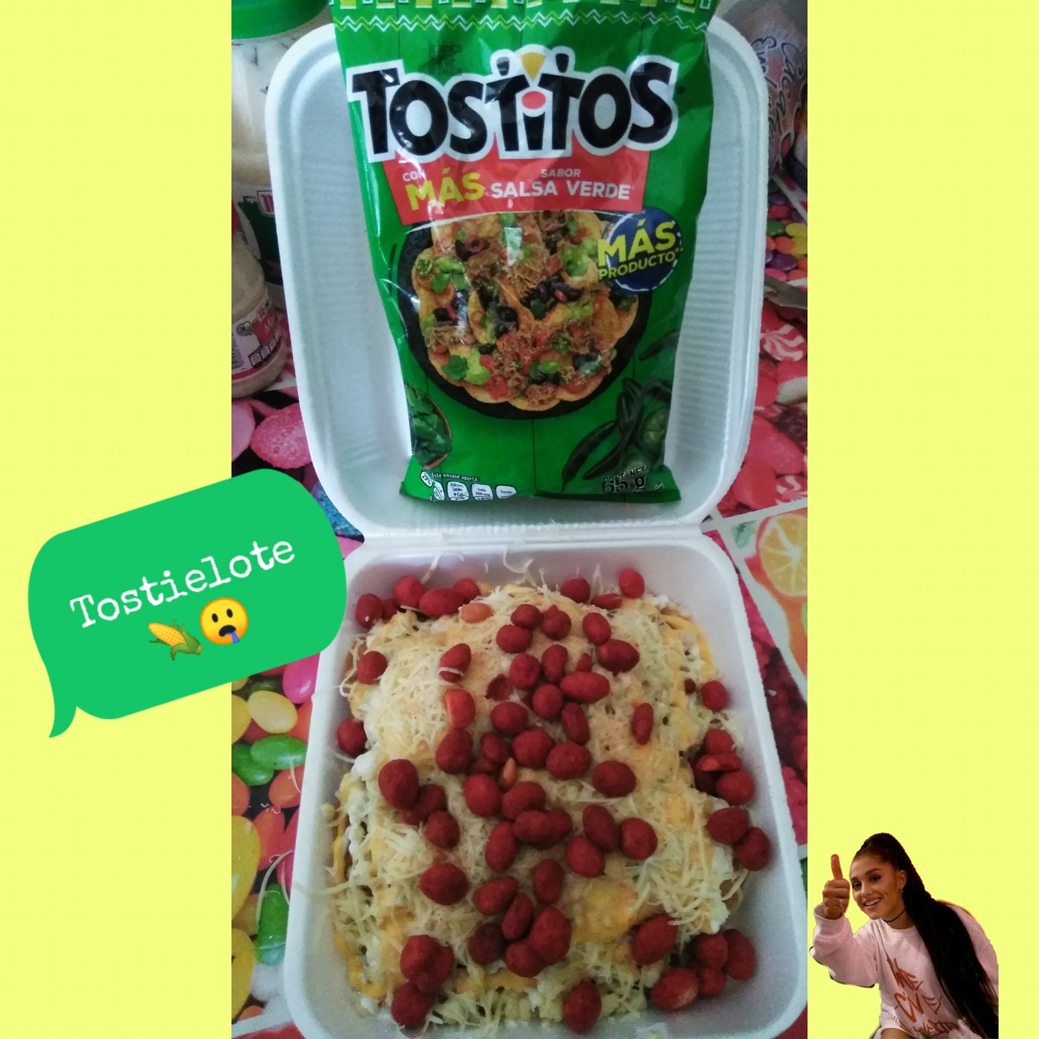 Base de Tostitos con elote, crema, queso para nachos y queso gouda rallado