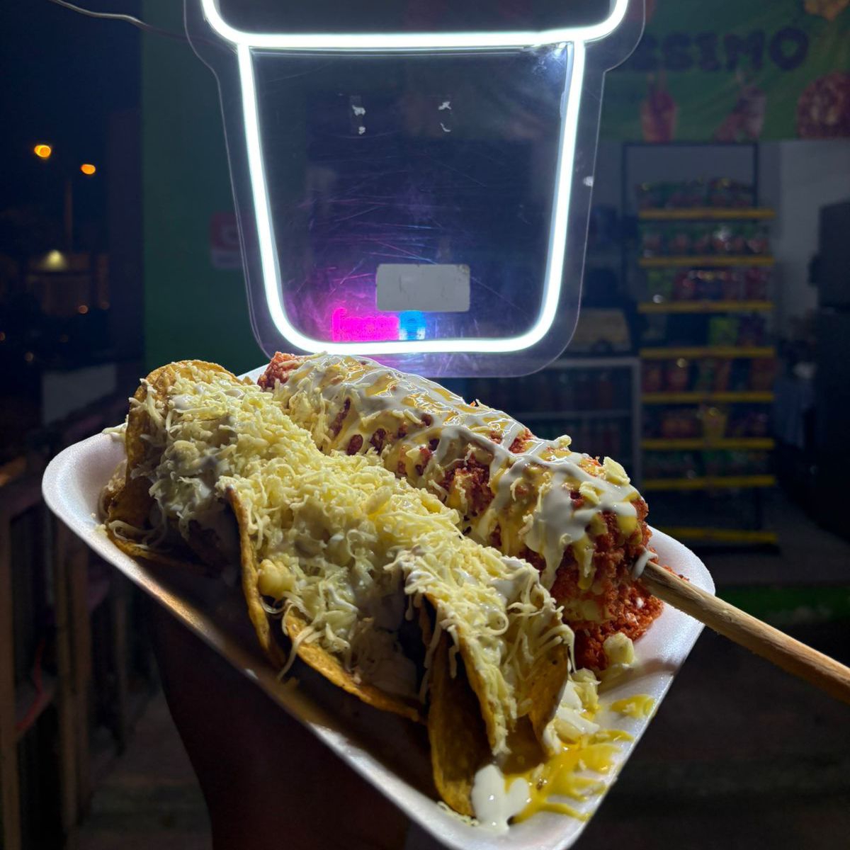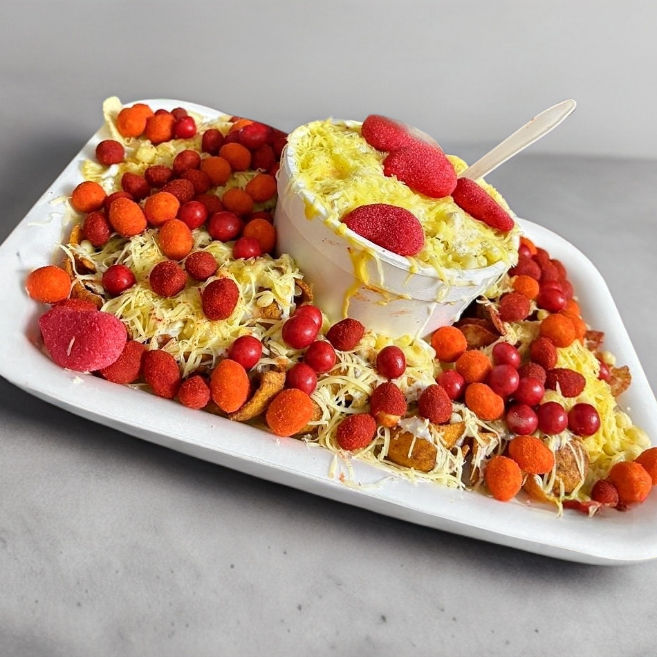 Base de fritura a elegir, con granos de elote, ques opara nachos,queso gouda rallado,crema, 1 topping a elegir
