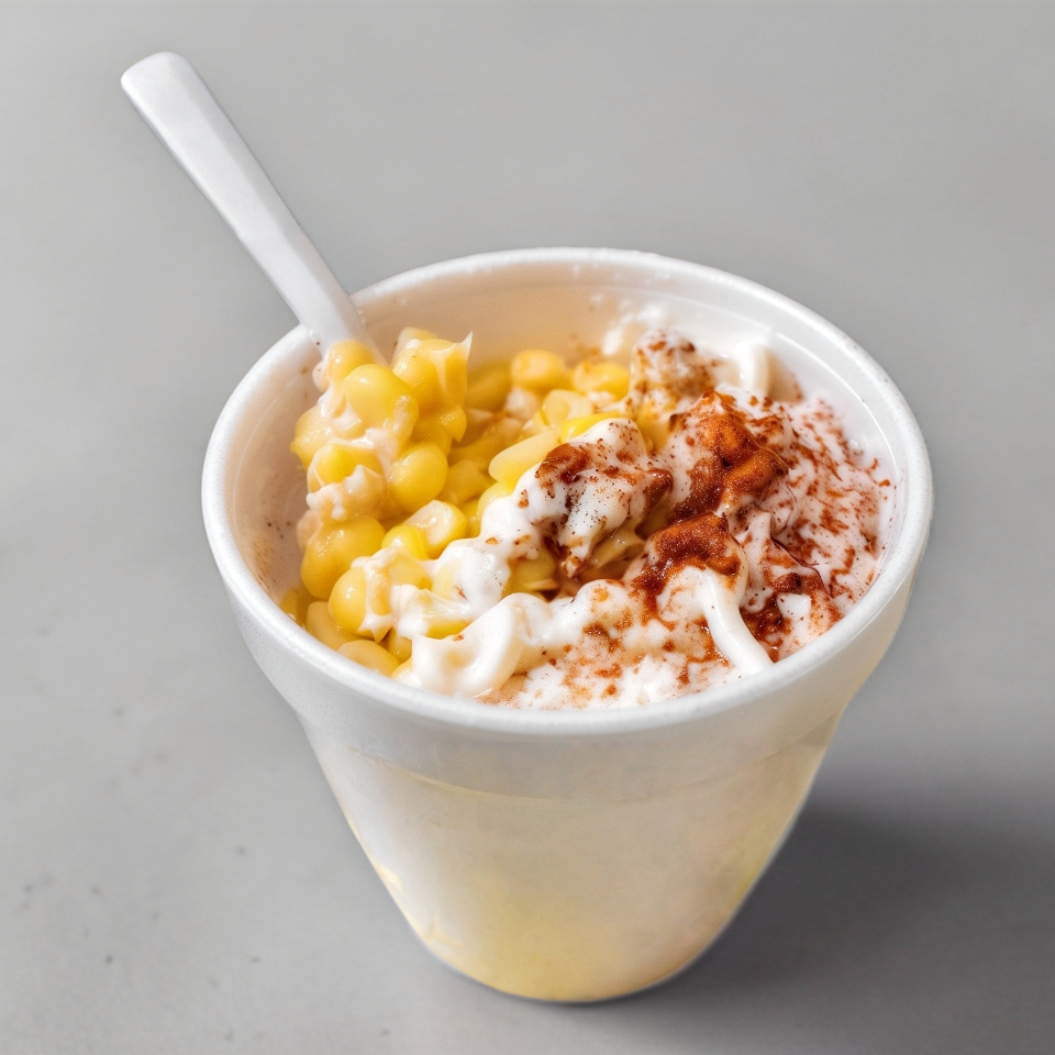 Granos de elote en vaso de 1 L preparado con crema, queso sopero y chile molido.