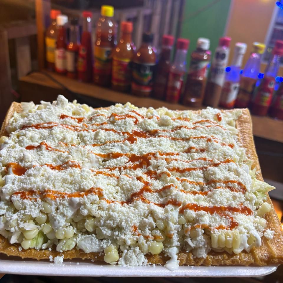 Chicharrón grande plano preparado con elote en grano repollo, queso sopero,crema y salsa picosita.