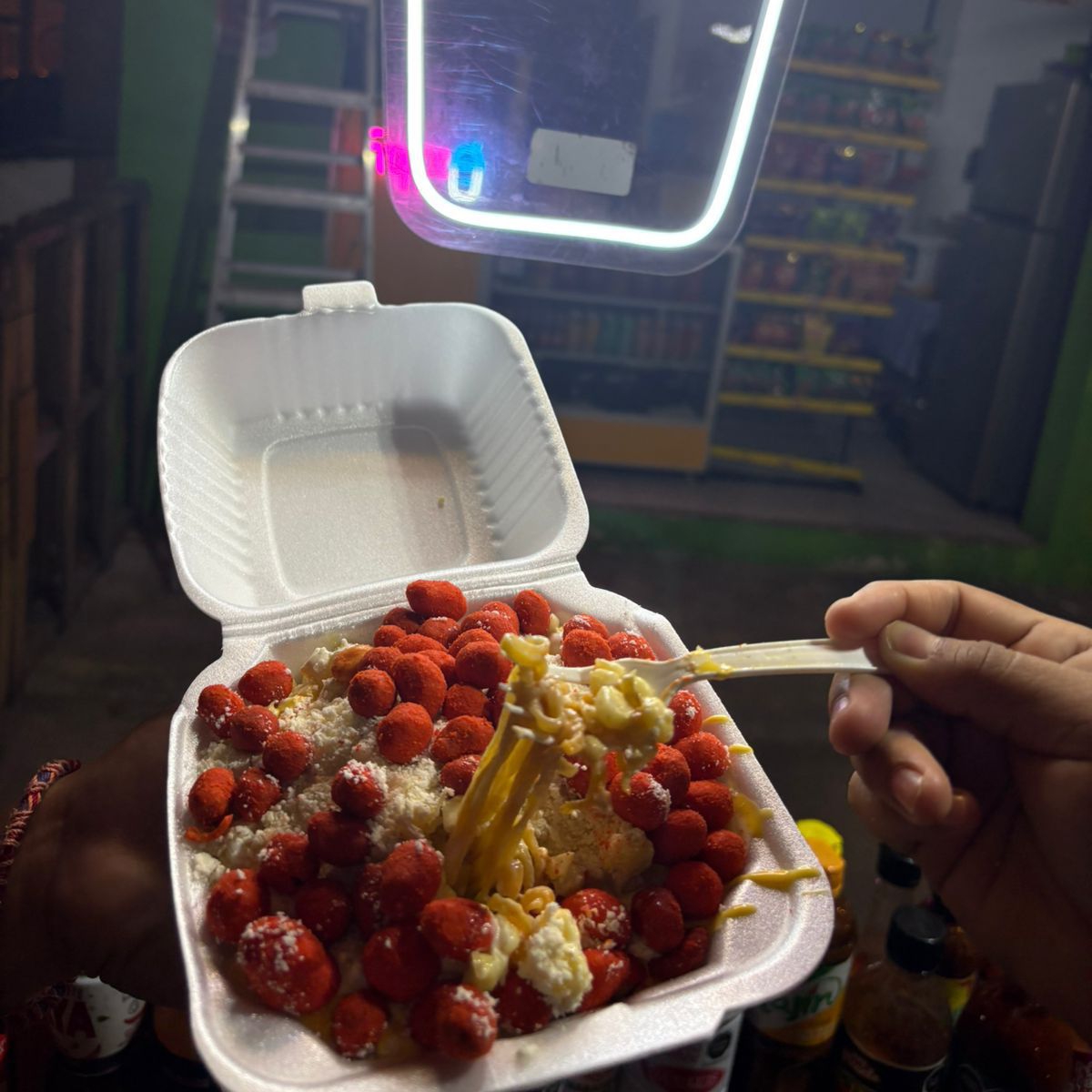 Charola de base de 3 fritura con granos de elote,queso gouda rallado y queso para nacho, vaso de 1/2 co granos de elote y 3 toping a elegir