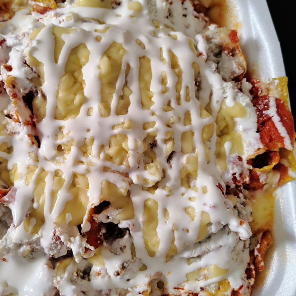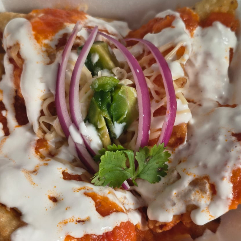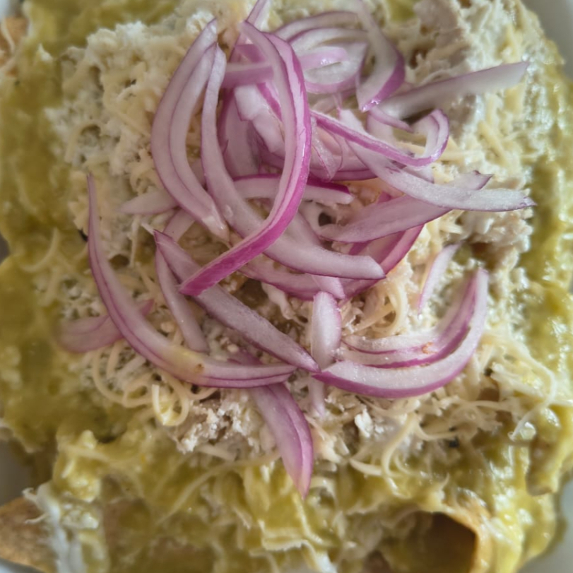 Totopos de maíz, bañados en salsa verde con pollo, coronados con queso y crema.