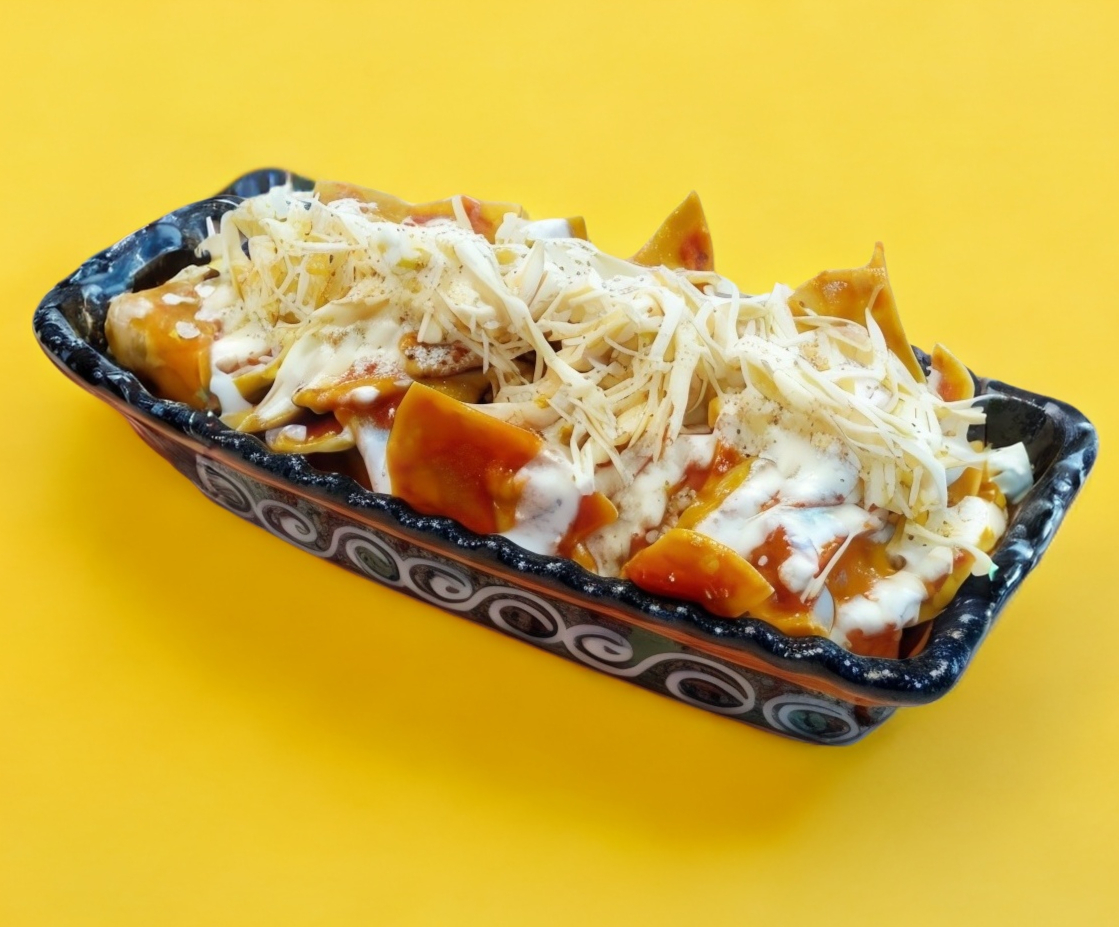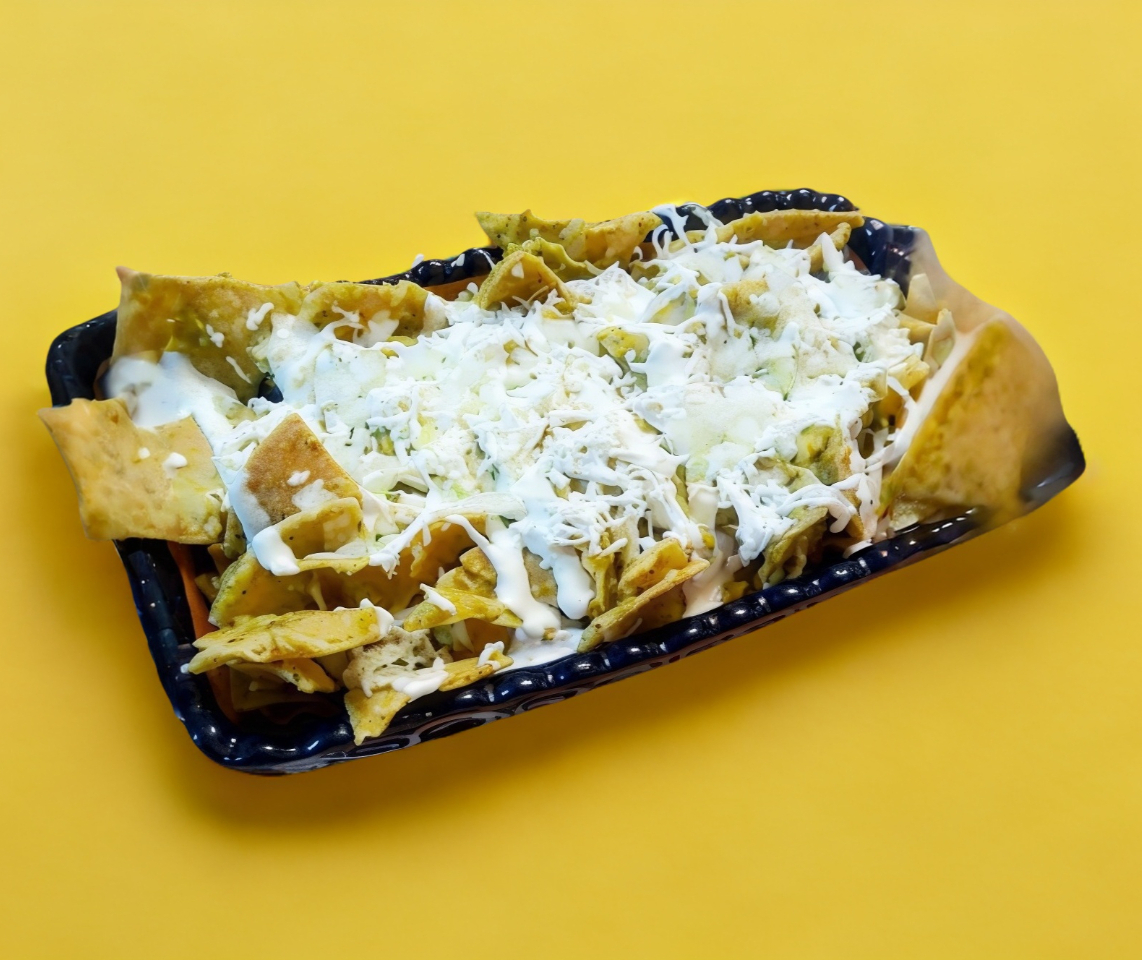 Deliciosa orden grande de chilaquiles con salsas verde y roja picositas, cubiertos con pechuga de pollo deshebrada, crema, queso blanco y cebolla picada.