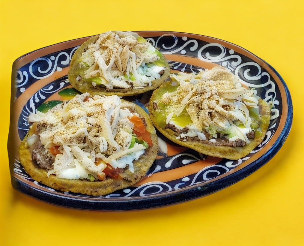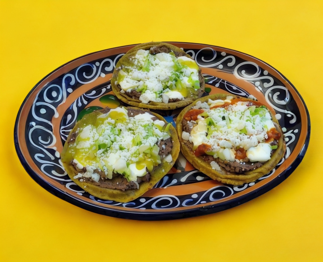 Orden de 3 sopes de masa de maíz, preparados con frijoles refritos, lechuga, crema, queso blanco y cebolla picada. Incluye salsa para acompañar al gusto.