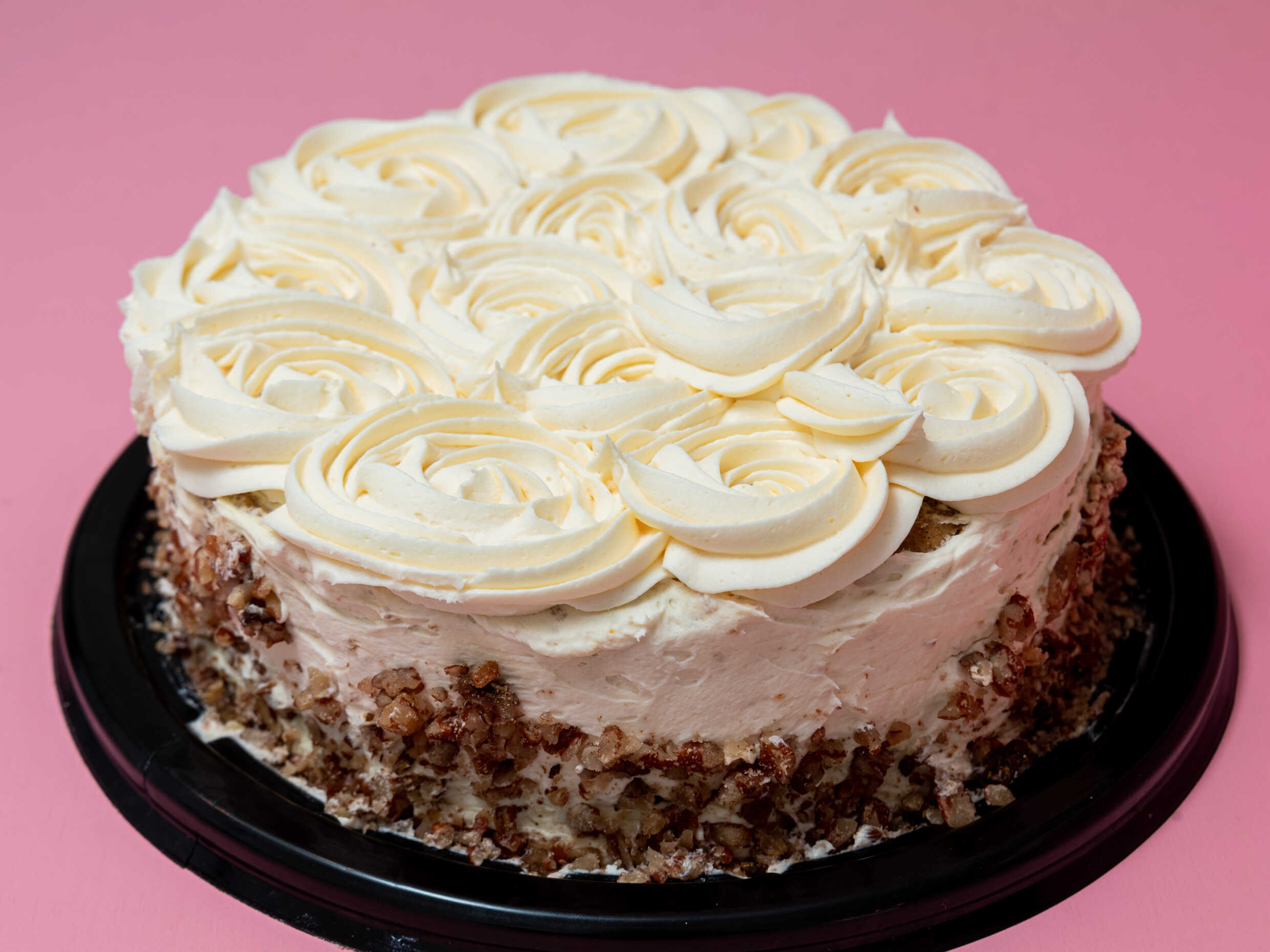 Pan con mezcla de Zanahorias ralladas, envuelto en una capa suave de glaseado de betún y Nuez