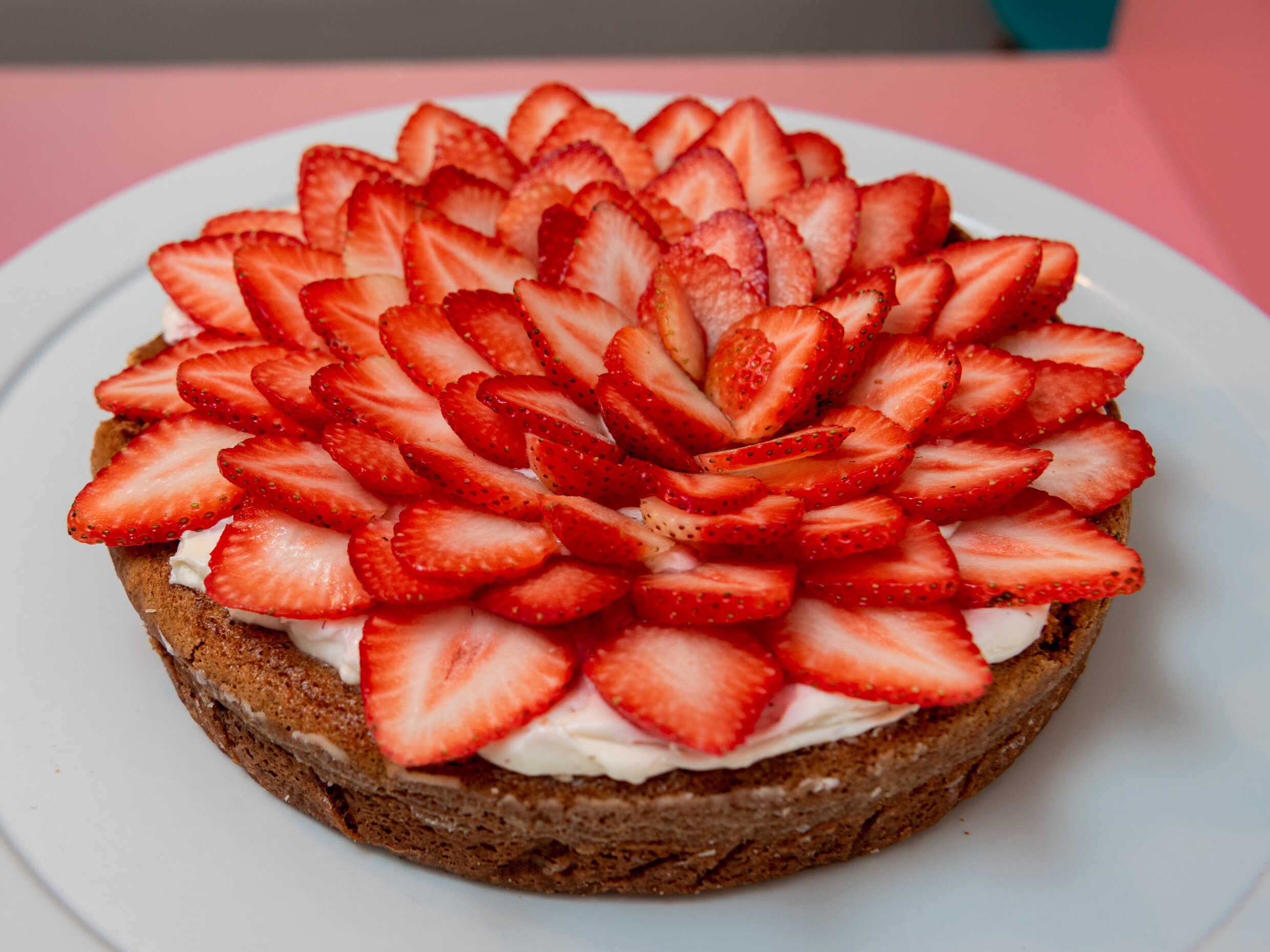 Base crocante de nuez y galleta, frosting de queso Philadelphia, coronado con fresas naturales.